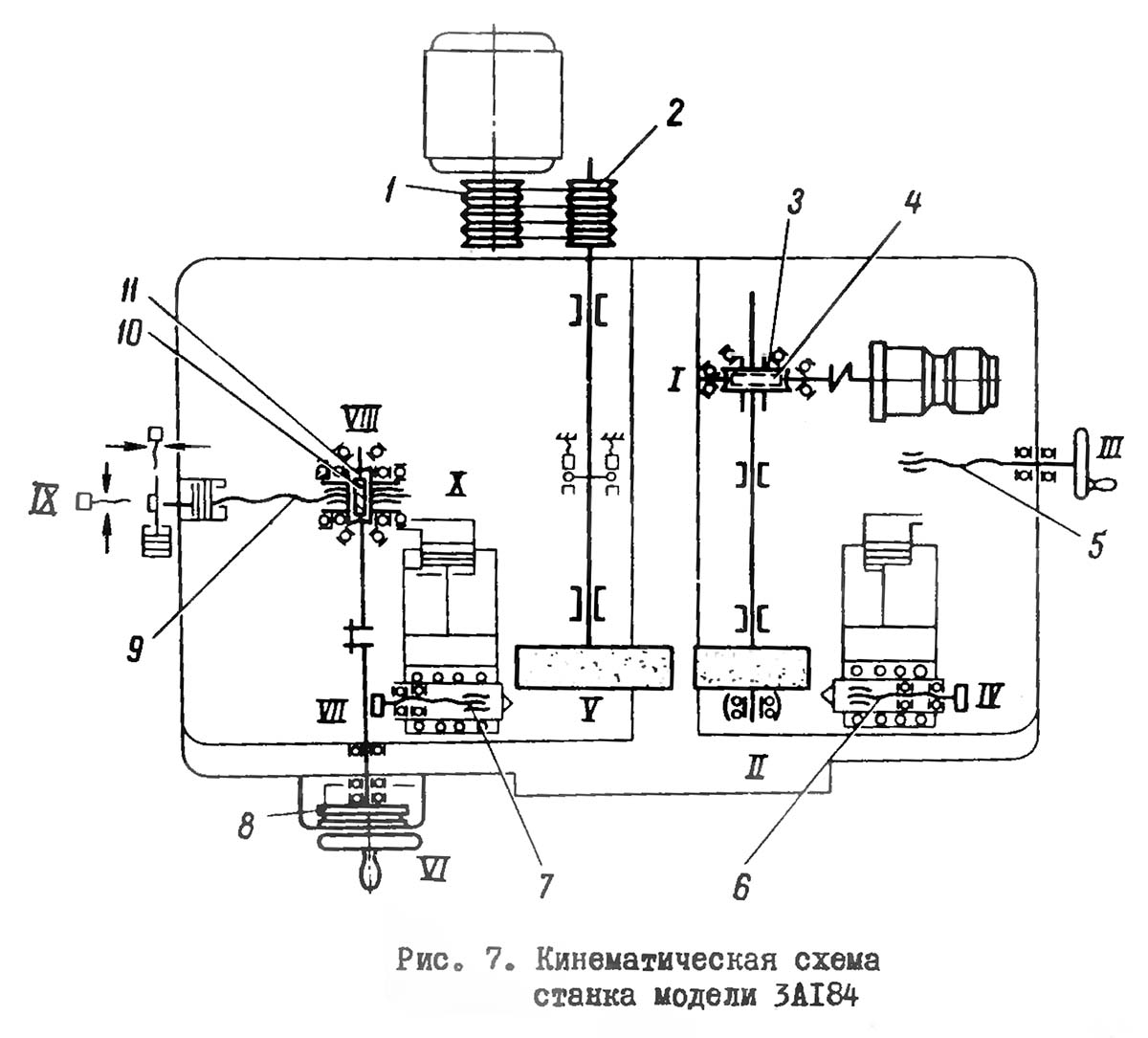 Ох механізма подач 8 шлифовальная бабка получает перемещение через валы V1, VIII і червячную пару 11, 10. Червячное колесо 11 одновременно является гайкой гвинта 9 і укреплено на корпусе шлифовальной бабки.