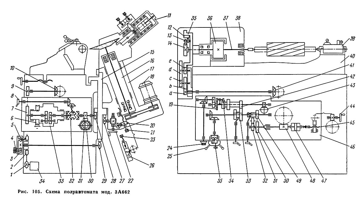 Все основні вузли напівавтомату выполнены в виде окремих агрегатов і смонтированы на станине или установлены рядом. Станина 1 напівавтомату (рис. 105) коробчатого сечения. По плоской і П-образной направляющим на задньої стенке станины в продольном направлении перемещаются шлифовальные салазки 15, осуществляющие продольную подачу при шлифовании. На салазках закреплена шлифовальная бабка 17 з електродвигуном приводу шлифовального круга 18. Шлифовальная бабка може поворачиваться в вертикальной плоскости по круговым направляющим салазок для установки оси шлифовального круга на угол наклона стружечных канавок. По направляющим станины в поперечном направлении вручную з помощью гвинта і гайки перемещаются поперечные салазки 40, несущие бабку вироби 38 і заднюю бабку 39. Бабка вироби установлена на поперечных салазках неподвижно. Задня бабка перемещается по направляющим салазок вручную. В окне передньої стенки станины установлен механізм подачі і спирали 46. Механізм правки 11 размещен на шлифовальной бабке. Справа от напівавтомату на фундаменте установлена гідростанція, а над ней размещен електрошкаф з пультом керування. Бак для СОЖ з магнитным сепаратором і насосом для її подачі в зону обробки расположен у левого торца станины под гітарою налаштування. Для защиты от разбрызгивания рабочая зона закрыта екраном, откидывающимся при загрузке верстата. Смазка основних механізмов верстата і направляючих централизована і осуществляется от сливной магистрали гідропривода.