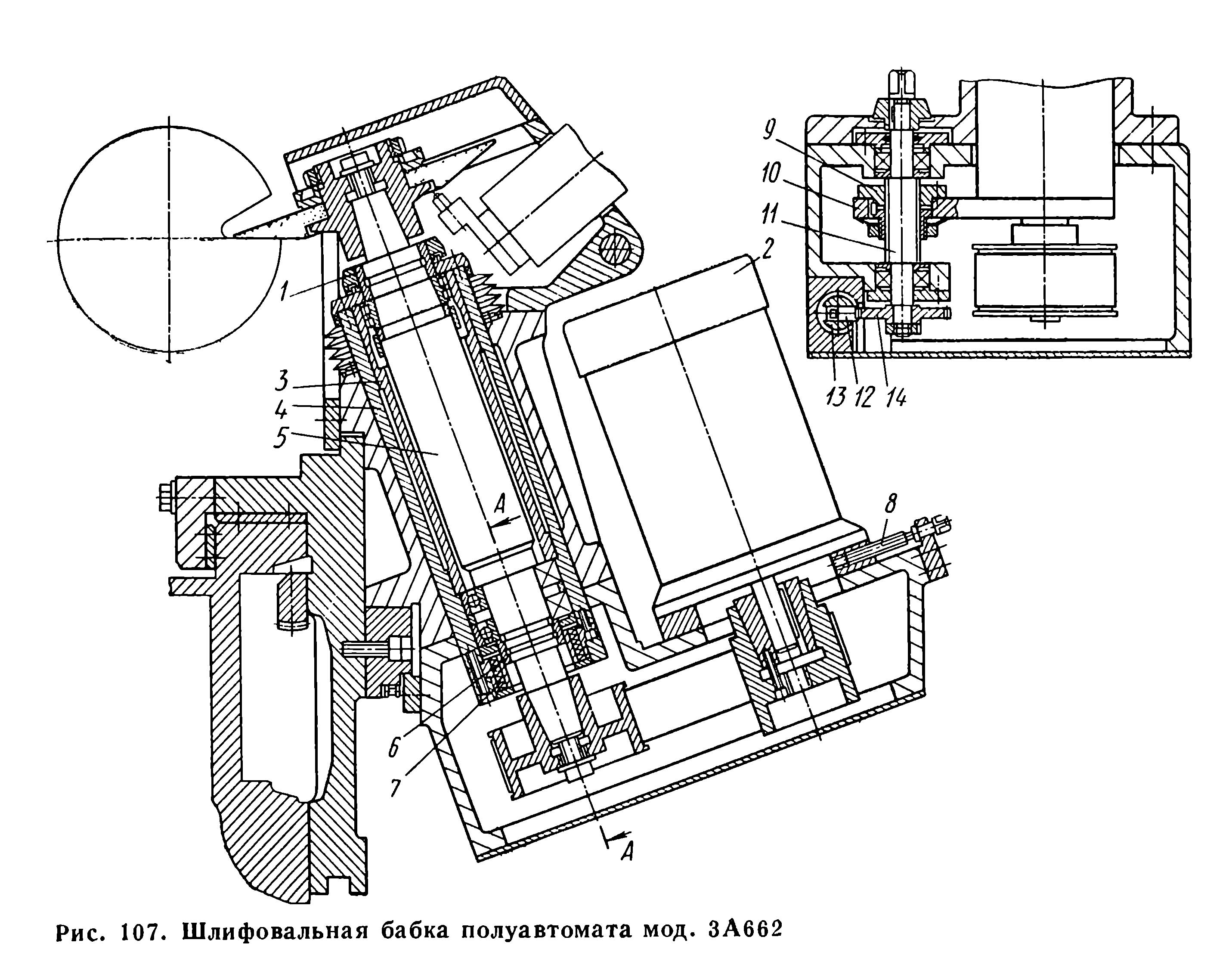 Конструкція шлифовальной бабки показана на рис. 107. Шпиндель 5 наклонен на угол 20° к вертикальной плоскости. Передний подшипник шпинделя — двухрядный роликовый з оригинальным наружным кольцом 3. В задньої опоре имеются два радиально-упорных підшипника, установленных з постоянным натягом пружинами 7. Внутренние кольца підшибників закреплены гідропрессовыми втулками 1 і 6. Вращение шпиндель получает от фланцевого електродвигуна 9 через плоскоременную передачу. Натяжение ремня осуществляется переміщенням електродвигуна 2 з помощью гвинта 8. Шлифовальная головка 4 перемещается от гідроцилиндра, плунжер которого 13 несет собачку 12, поворачивающую храповик 14, посаженный на винте 11. Винт, вращаясь, перемещает разрезную гайку 9, закрепленную в кронштейне 10, жестко связанном со шлифовальной головкой 4. Величину переміщення устанавливают упором.