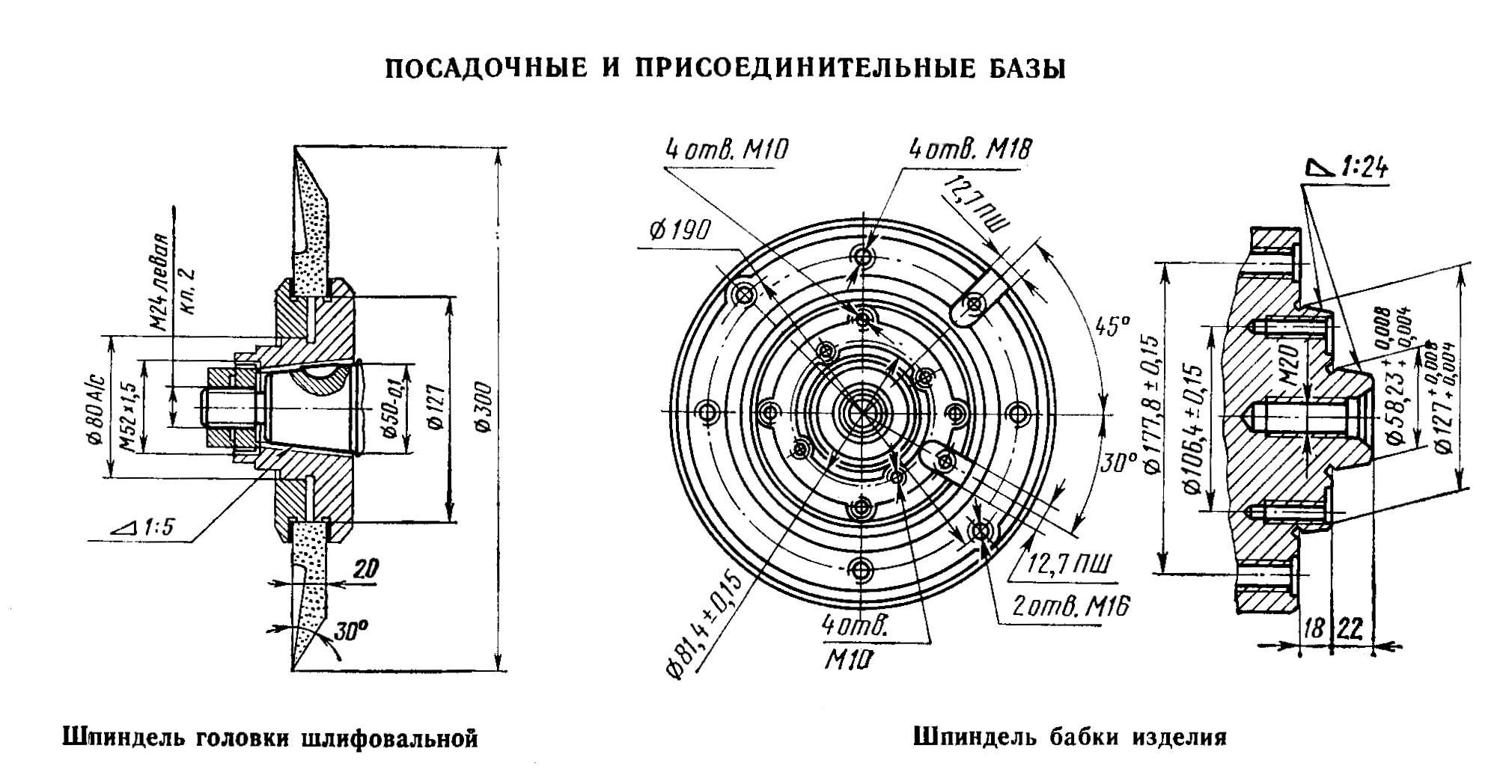 Бабка вироби (рис. 124) предназначена для закрепления затачиваемой зуборезной головки і поворота її при установці относительно шлифовального круга вокруг трех взаимно перпендикулярных осей. Зуборезную головку устанавливают на одну из двух конусных посадочных поверхностей шпинделя 12 і притягивают к его торцу болтами. При заточке резцовых головок з посадочным отверстием большего или меньшего диаметра, чем диаметр посадочных конусов шпинделя, их крепят з помощью промежуточных фланцев.