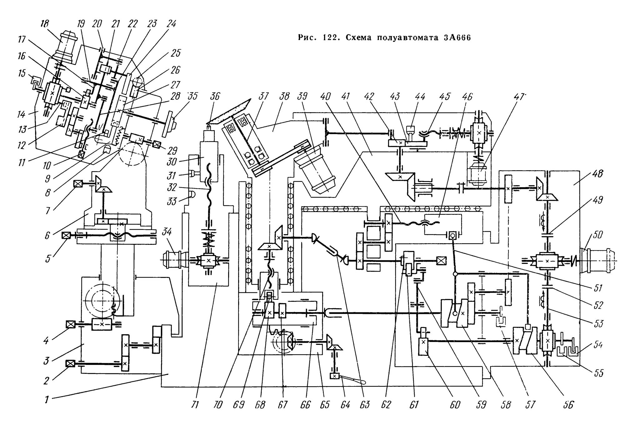 Напівавтомат 3А666 скомпонований з вузлів, що окремо збираються. По горизонтальним (V-подібною і плоскою) роликовим напрямним станини 1 (рис. 122) переміщаються шліфувальні санки 41, що несуть шліфувальну бабку 38, що здійснює качательные (осцилюючі) руху горизонтальній площині і вертикальну подачу на глибину різання при заточуванні і правку. До нижньої частинини шліфувальних санок прикріплений механізм подачі 65. Механізм приводу 48 осциляції шліфувальної бабки, переміщення шліфувальних санок і вертикальної подачі шліфувальної бабки змонтований у вікні правого торця станини і закритий кожухом. Зліва від шліфувального кола на станині встановлений механізм правки 71, що несе гільзу 30 з алмазом 36. З лівого торця станини по направляючих ковзання в поперечному напрямку переміщається вручну каретка 3, несуча бабку виробу 6. Крім поперечного переміщення каретка забезпечує пересувне бабці виробу поздовжнє. Баба виробу має можливість повертатися на каретці навколо своєї осі, а її шпиндель 35 повертатися навколо своєї осі і нахилятися. На бабці виробу встановлений механізм автоматичного поділу 14. Пульт керування розміщений на передній стінці шліфувальних санок. Шафа з електроустаткуванням прикріплена до задньої стінки станини. Бак для СОЖ з насосом та магнітним сепаратором встановлений поруч із верстатом.