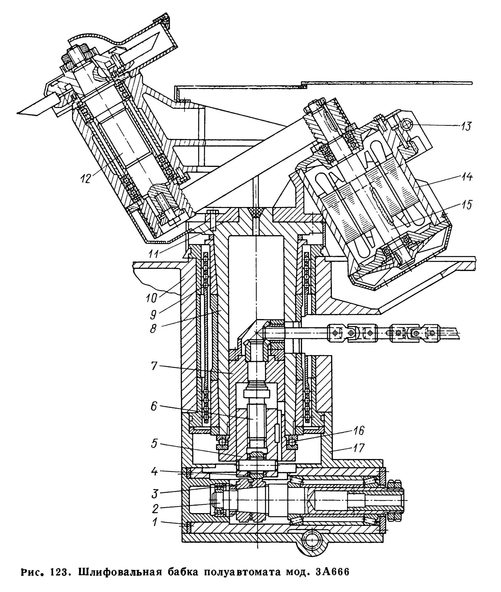Шлифовальная бабка (рис. 123) представляет собой колонну 8 з закрепленным на ней корпусом 11, в расточках которого установлены на підшипниках качения шпиндель шлифовального круга 12 і корпус встроенного електродвигуна 14. Шпиндель связан з електродвигуном плоскоременной передачей. Натяжение ремня осуществляют поворотом корпуса 14, наружная поверхность которого ексцентрична относительно оси ротора 15, і фиксируют стяжным болтом 13. Колонну 8 устанавливают в расточке корпуса 10 шлифовальных салазок на двух четырехрядных шариковых підшипниках 9. Для выбора зазоров в підшипниках посадочные шейки колонны і внутренние кольца підшибників выполнены коническими. К нижней частини корпуса шлифовальных салазок прикреплен корпус механізма 17, в котором перемещается гильза 1 з кулачковым валом 2. На кулачковом валу закреплены черновой і чистовой кулачки подачі 3, на один из которых через ролик 4, ползушку 5, винт б, гильзу 7 і упорный подшипник 16 опирается колонна шлифовальной головки.