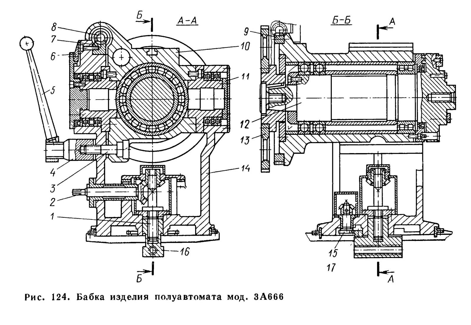 Установка бабки вироби 3А666 в вертикальном направлении происходит при вращении вала червяка 4 за квадрат, в поперечном направлении — при вращении вала 2 за квадрат. Перемещение бабки вироби в продольном направлении обеспечивается вращением за квадрат гвинта 5, гайка которого закреплена в корпусе бабки вироби. Угловые установки шпинделя происходят следующим образом. Шпиндель вироби 35 поворачивают за квадрат червяка 25, связанного з механізмом деления 14, обкатывающегося вокруг червячного сектора 26 на бабке вироби; наклон шпинделя обеспечивается вращением червяка 29, связанного з поворотным корпусом і обкатывающегося вокруг сектора, закрепленного на нижней частини бабки вироби; бабка вироби поворачивается вокруг вертикальной оси вращением вала 7.