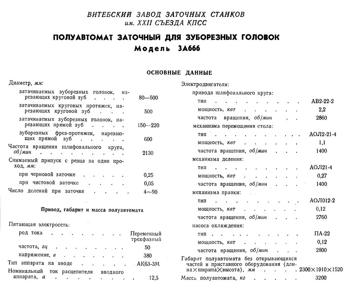 Напівавтомат моделі 3А666 призначений для абразивного заточування різцевих зуборізних головок для нарізування конічних коліс з круговими та прямими зубами. Напівавтомат розроблений Вітебським ВКВ ЗШ та ЗС (конструктор В. Р. Полудеткін).