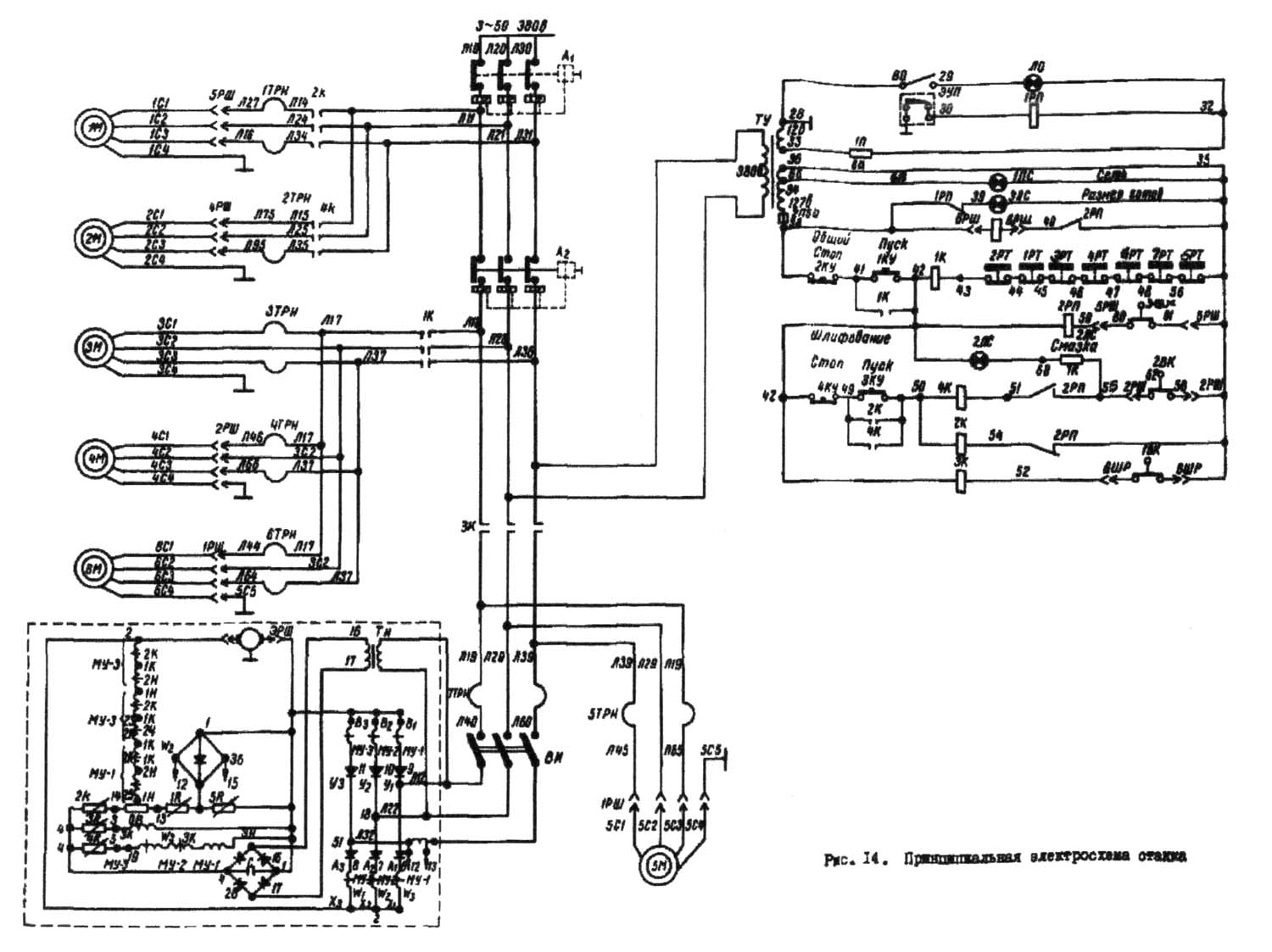 После нажатия кнопки 1КУ «Пуск общий» катушка магнитного пускателя 1К получает питание і закрывает свои контакты НО. Катушка становится на самопитание. Электродвигатели гідронасоса 3М, насоса змазки 4М і двигатель магнитного сепаратора подключаются к сети. Реле 2РП получает питание і закрывает свои контакты НО. Подключается електромагнит 1Э і загорается сигнальная лампочка «Смазка». После нажатия кнопки ЗКУ «Пуск шлифования» катушка магнитного пускателя 4К получает питание і становится на самопитание. Подключается двигатель наружного шлифования. Подвод шлифовальной бабки, увімкнення ходу стола і увімкнення подачі осуществляют гідравлически рукояткой керування. При етом нажимают кінцівой выключатель 1BK і включают магнитный пускатель ЗК. Подключают електродвигатели насоса емульсии і приводу вироби.