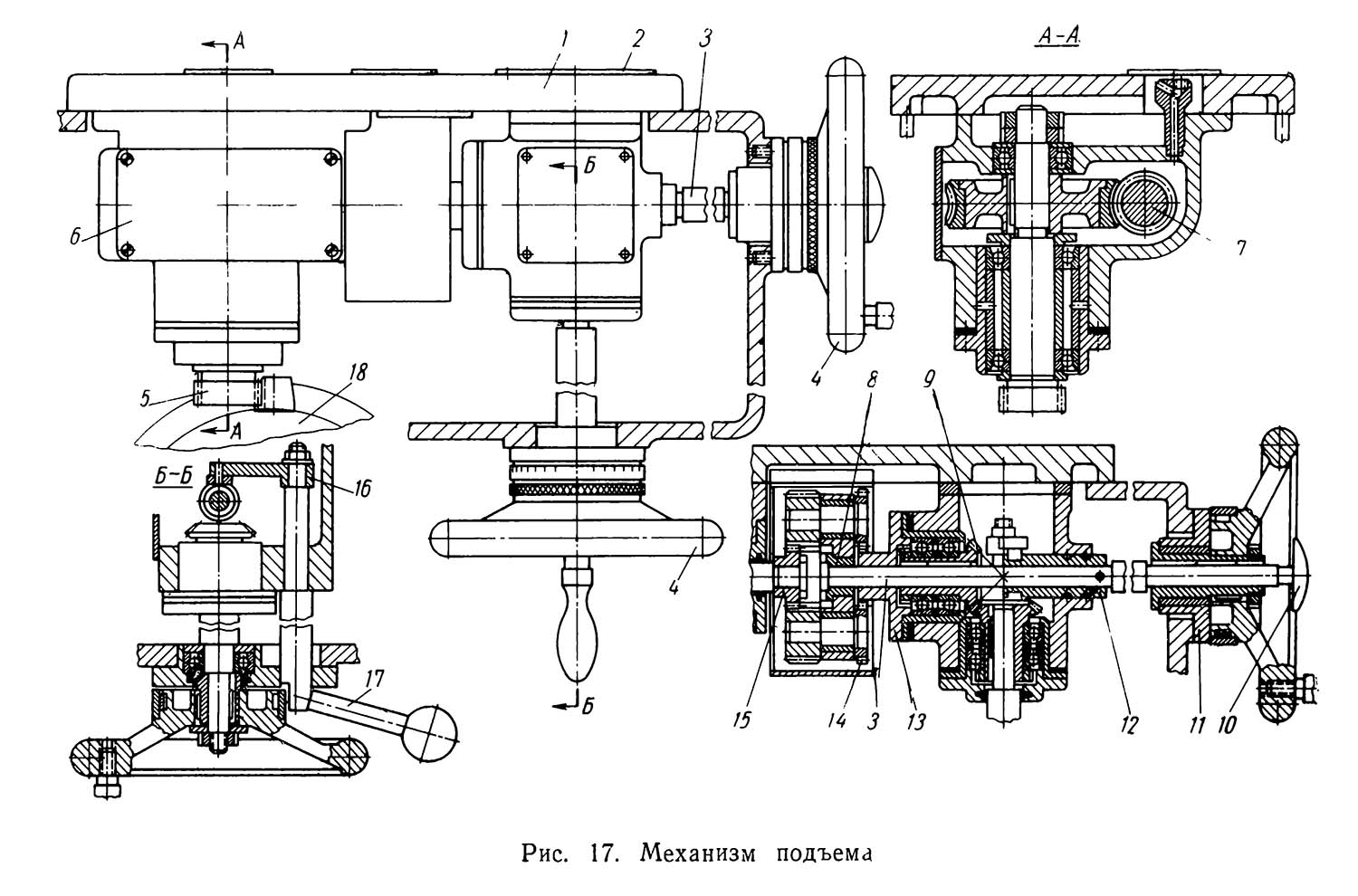 При демонтаже механізма подъема первоначально снимаются: маховичок з кнопкой 10 з переднего робочого места, фланец 11, рычаг 16 через окно, закрытое крышкой 2; стержень з рукояткой 17 і маховичок з валом з бокового робочого места. Весь механізм вынимается из станины совместно з плитой 1, в которой предусмотрены закрытые пробками отверстия для рымболтов.