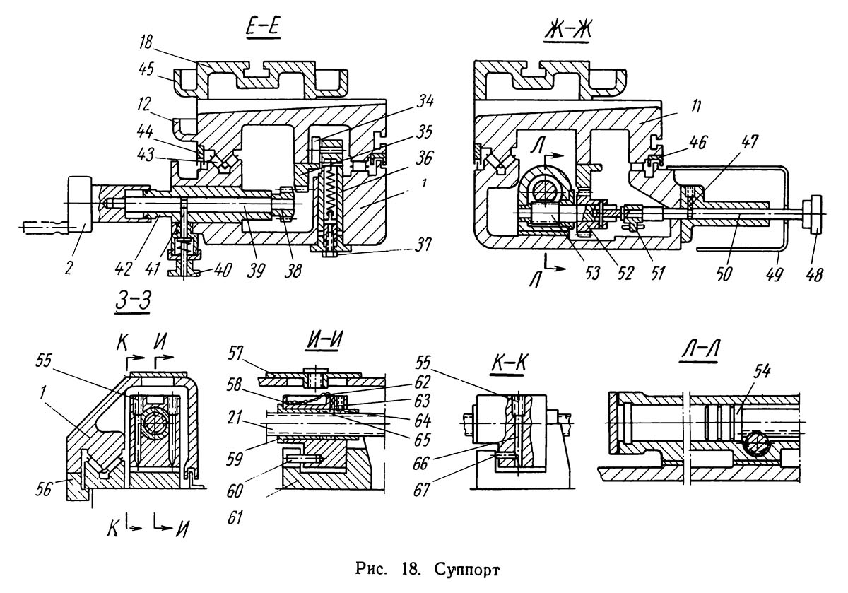 Смазка ходового гвинта — капельная через фитиль 62, подающий масло из ванны в корпусе 58 на резьбу ходового гвинта. Масло заливают через отверстие в крышке 57.