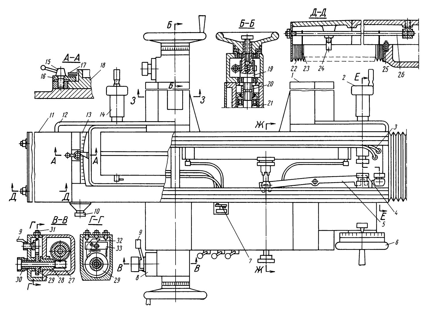 Нижние салазки 1 перемещаются в поперечном направлении по станине по направляющим качения з помощью ходового гвинта 21, установленного на шарикопідшипниках. На переднем кінці гвинта смонтирован механізм ручного переміщення з механізмом толчковой подачі 5, который допускает подачу маховичком 30 или рычагом 9. Один поворот рычага обеспечивает поворот на один зуб храпового колеса 29, установленного жестко на стержне червяка 27 і связанного з винтовой шестерней ходового гвинта. Рычаг жестко установлен на одной оси з рычагом 33, несущим собачку 32, і качается в пределах, ограниченных регулировочными гвинтами 31. Под действием пружин, при отпущенном рычаге 9 рычаг 33 постоянно удерживает собачку 32 в выведенном из зацепления з храповиком положении, чем обеспечивает свободное реверсирование храповика и, следовательно, возможность ручной поперечної подачі, маховичком 30. Втулка 28 червяка 27 выполнена ексцентричной для возможности выбора люфта в зацеплении.