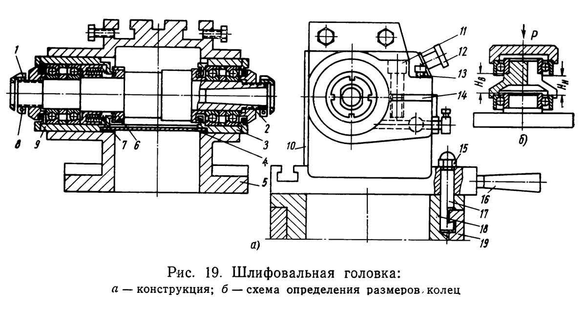 Шлифовальная головка жестко закреплена на колонне 18 і поворачивается (вместе з колонной) вокруг її вертикальной оси рукояткой 16. Фиксация осуществляется гайкой /5, при етом палец 17 притягивает торец колонны 18 к торцу гильзы 19.