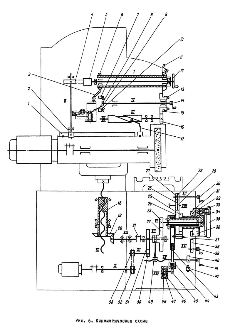 Ручна подача . Рух від маховика 35 передається через шестерні 23, 22, муфту 21, конічну пару шестерень 20, 19 на гайку 18, пов'язану з гвинтом IX.