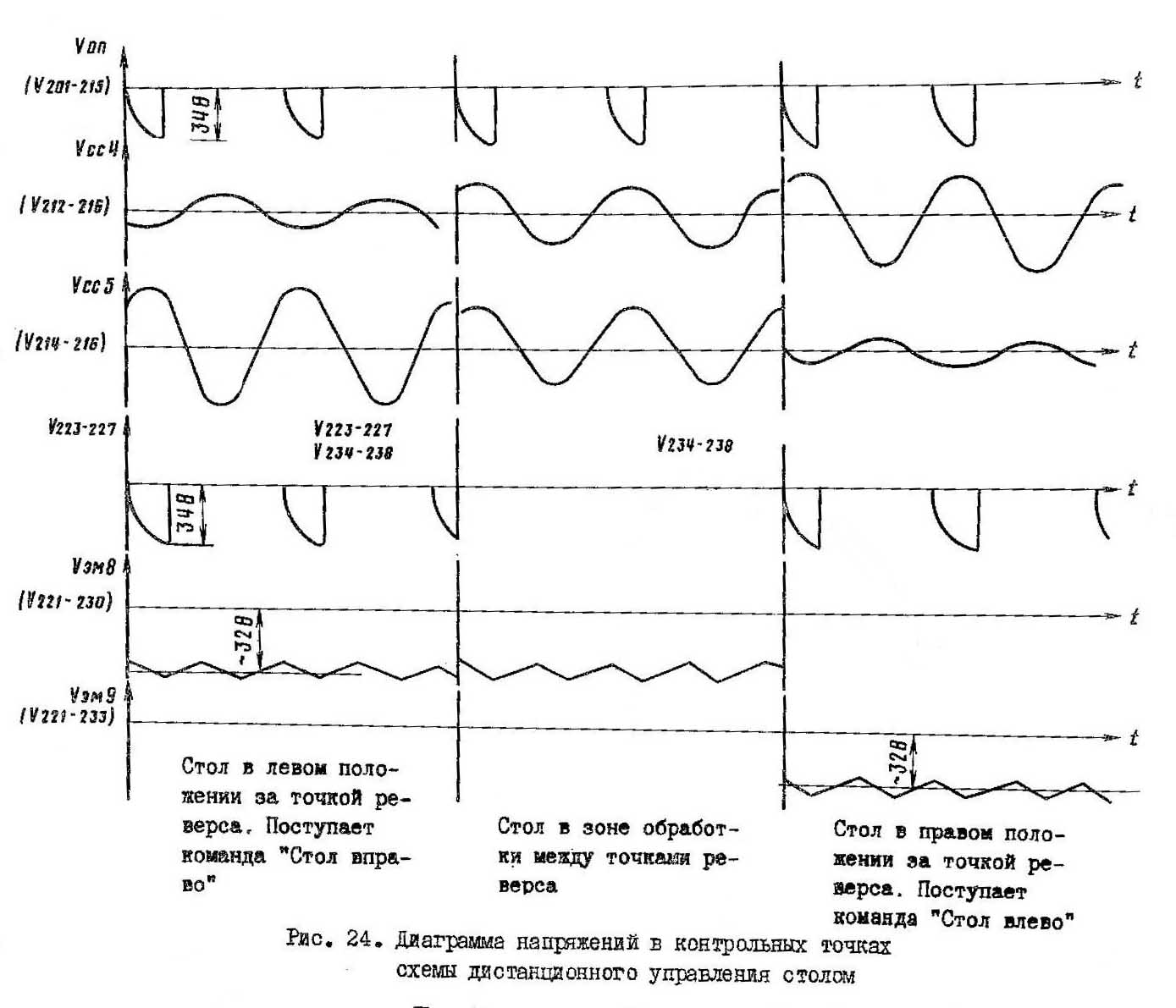 На максимальной скорости стола Vmax движок потенциометра КЗ установлен в крайнем правом положении (точки 216-247 закорочены) і команды на реверс поступают в точках А і В і изменения фаз напряжений сельсинов Сс4 і Сс5 (см. рис. 22 і 23).