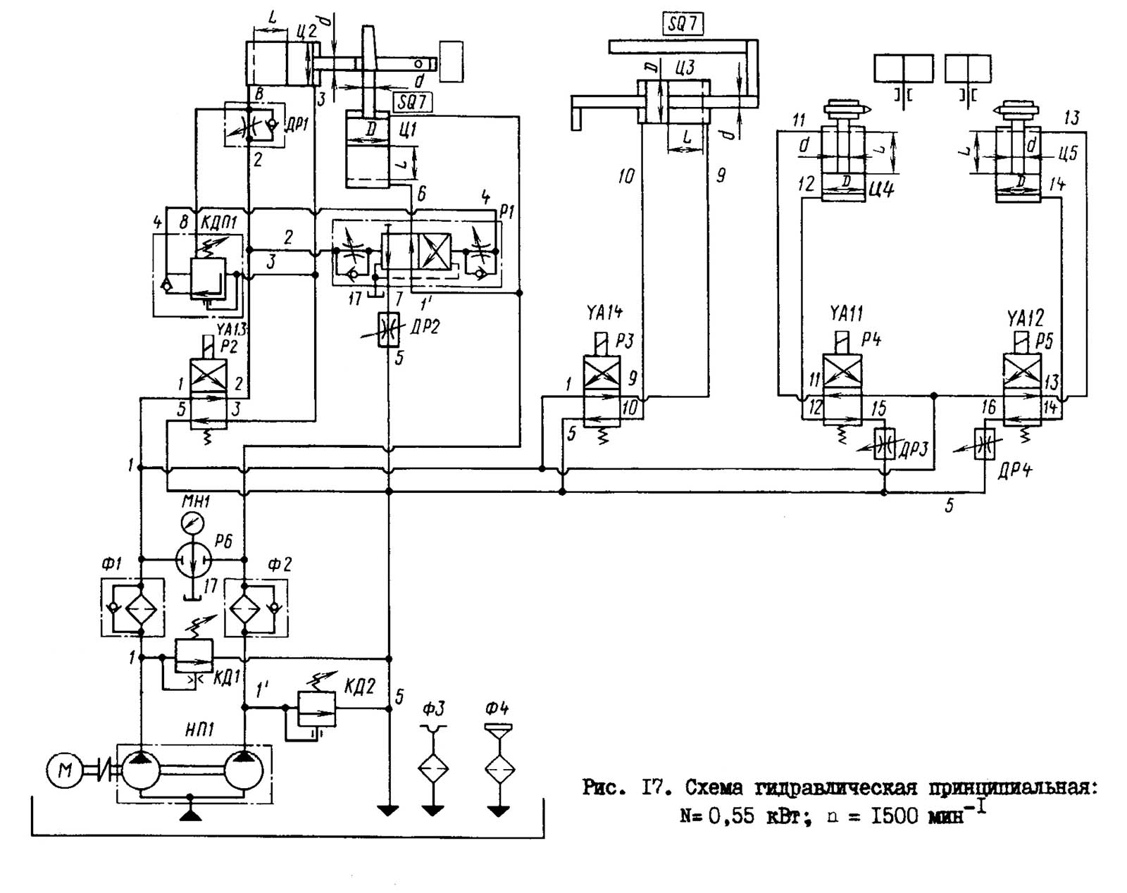 Нажатием кнопки "Гідропривід" включается електродвигатель приводу насоса НП1. Потоки масла через фильтры Ф1 і Ф2 по магистралям 1 і 1 поступают в гідросистему напівавтомату. Давление масла регулируется гідроклапанами давления КД1 і КД2.