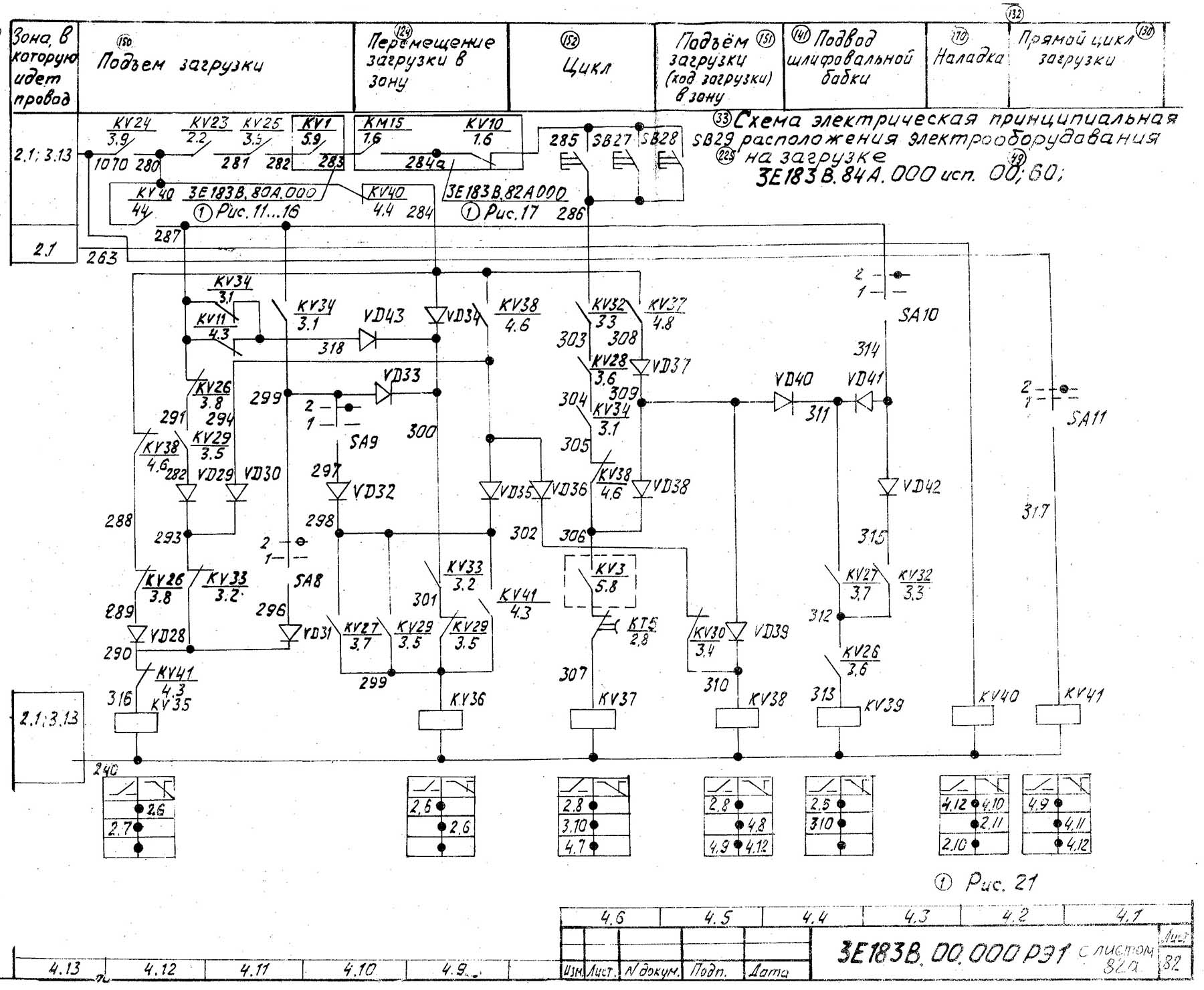 В зоне 4.3. включается реле KV41. Загрузка находится впереди внизу, шлифовальная бабка находится в исходном положении (замыкающие контакты реле KV28, KV32, KV34 в зоне 4.8). Теперь при отсутствии цикла правки (размыкающий контакт реле KV10 в зоне 3.9) кнопками SB27, SB28, SB29 включается реле KV37 т.е. «Цикл».