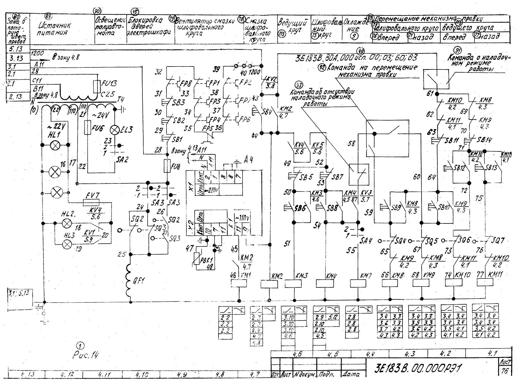 При наличии давления змазки шлифовального і ведущего кругов в напівавтоматі моделі 3Е183А нажимаются выключатели конечный - SQ13 і SQ14, которые включают реле КV4 в зоне 5.4.
