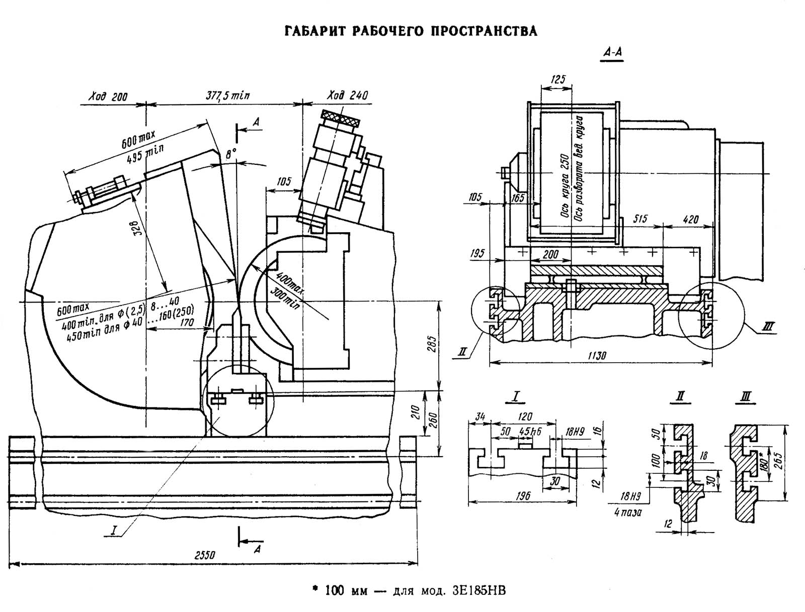 3Е185 Габарит робочого простору бесцентровошлифовального верстата. Дивитись у збільшеному масштабі