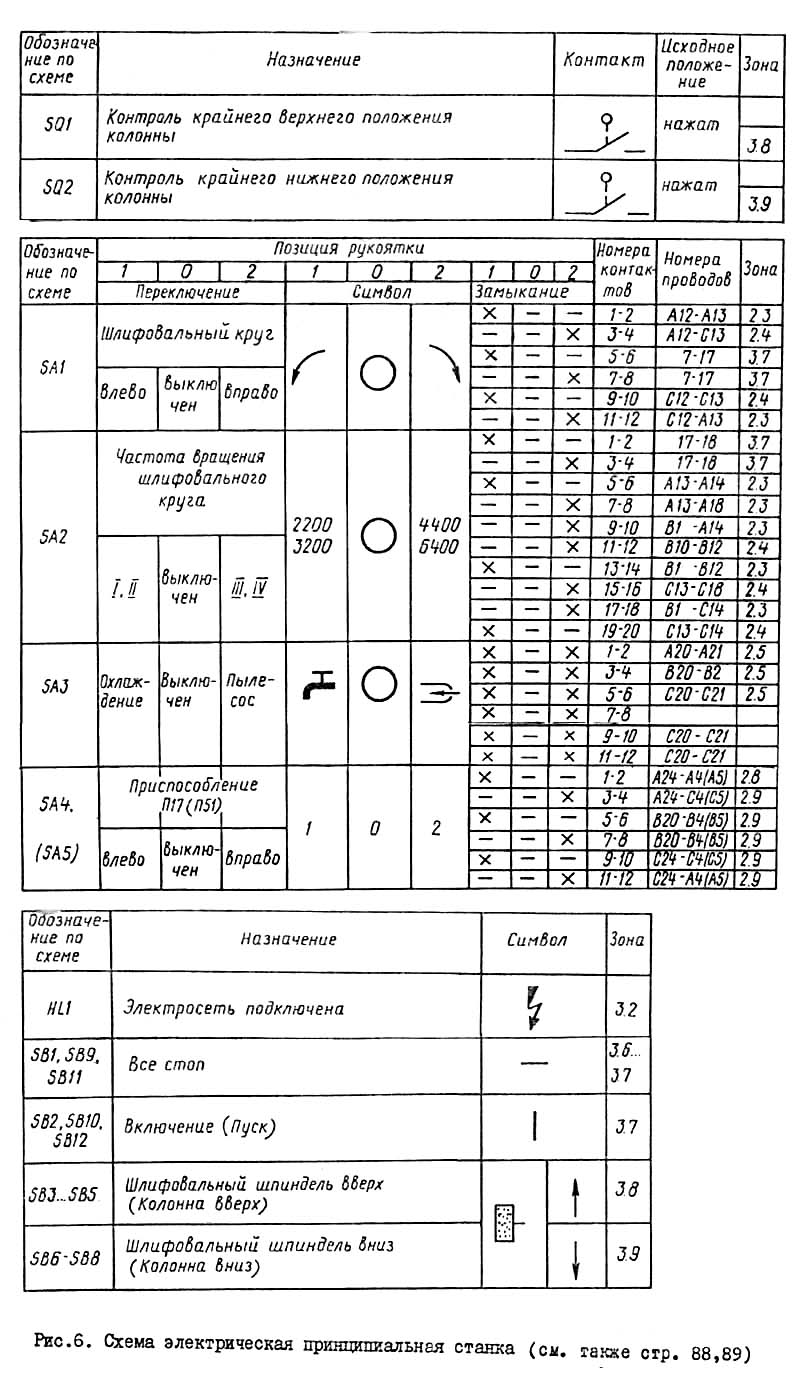 Пуск шлифовального круга, насоса охлаждения (пылесоса), пристосувань осуществляется выключателями SB10, SB11, SB12, останов - выключателями SB1, SB2, SB3 ("Все стоп"). Направление обертання і частота обертання шлифовального круга определяется переключателями SAI, SA2, соответственно. Насос охлаждения (пылесос) также можно отключать автономно переключателем SА3. Выбор направления обертання і автономный останов пристосувань П17, П51 можно осуществить переключателями SA4 і sA5, соответственно.