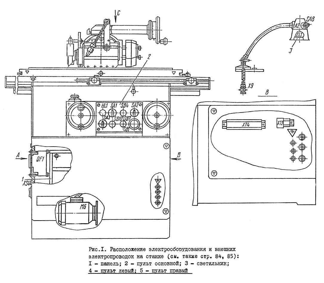 Насос охлаждения (пылесос) также можно отключить автономно переключателем SA3. Выбор направления обертання і автономный останов пристосувань П17, П51 можно осуществить переключателями SA4 і SA6, соответственно. Приспособление П58 подключается через разъем XI (вместо приводу шлифовального круга) в станке о преобразователем частоти і управляется органами керування приводу шлифовального круга, описанными выше.