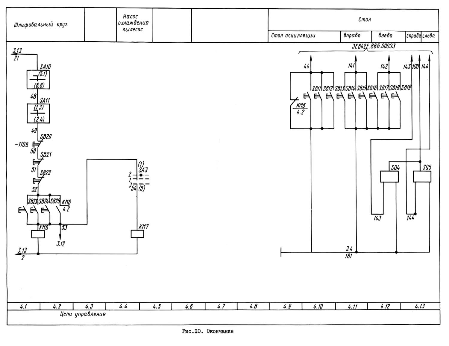 Пуск шлифовального круга, насоса охлаждения (пылесоса), пристосувань осуществляется выключателями SB23… SB25, останов - выключателями SB20… SB22. Направление обертання шлифовального круга определяется переключателем SA10. Частота обертання вала електродвигуна шлифовального круга в станке без преобразователя частоти выбирается переключателем SA11. Положение "1" - 1500 об/мин, положение "2" - 3000 об/мин. В станке з преобразователем частоти переключатель SA11 служит для выбора режима роботи з преобразователем частоти (положение "I") или без преобразователя частоти (положение "2") з регулюванням частоти обертання регулятором преобразователя A1.