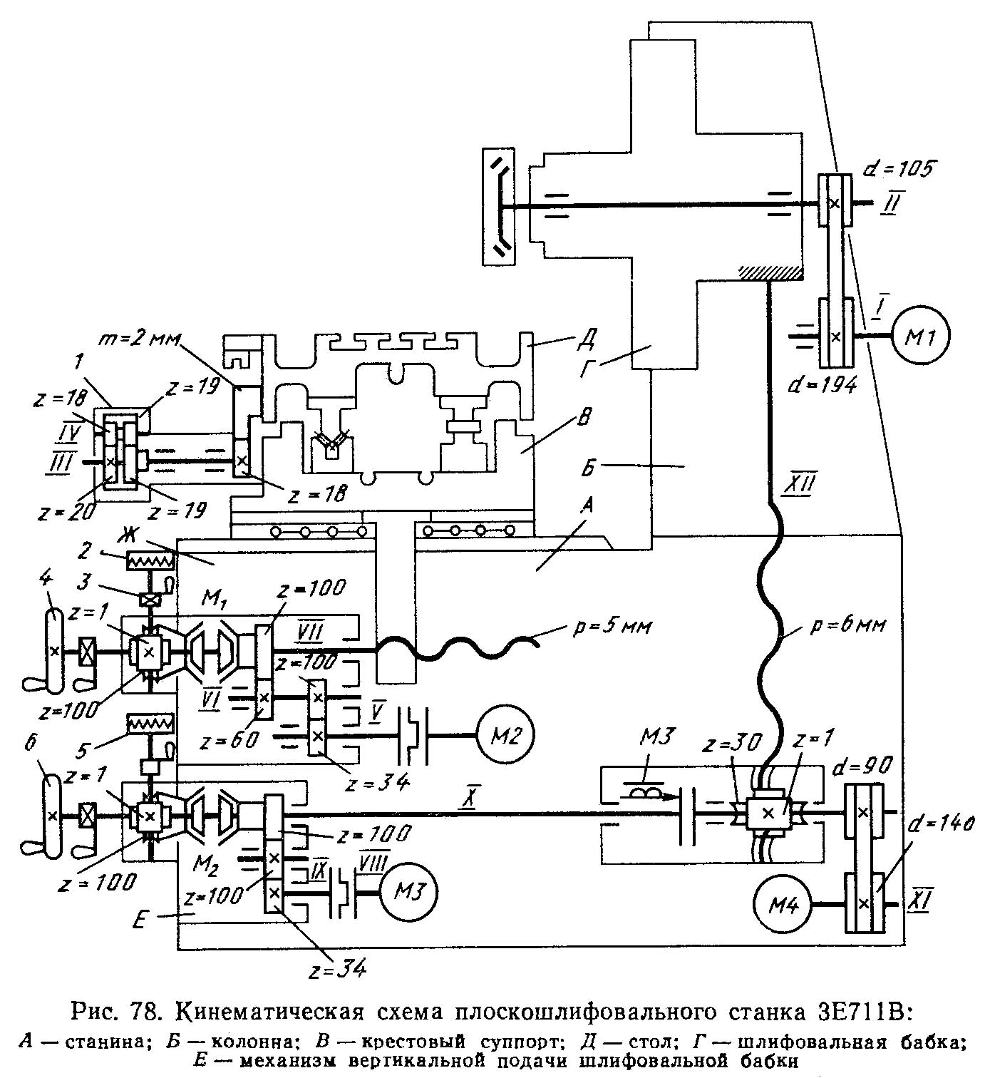 Схема кінематична плоскошліфувального верстата 3Е711В. Дивитись у збільшеному масштабі