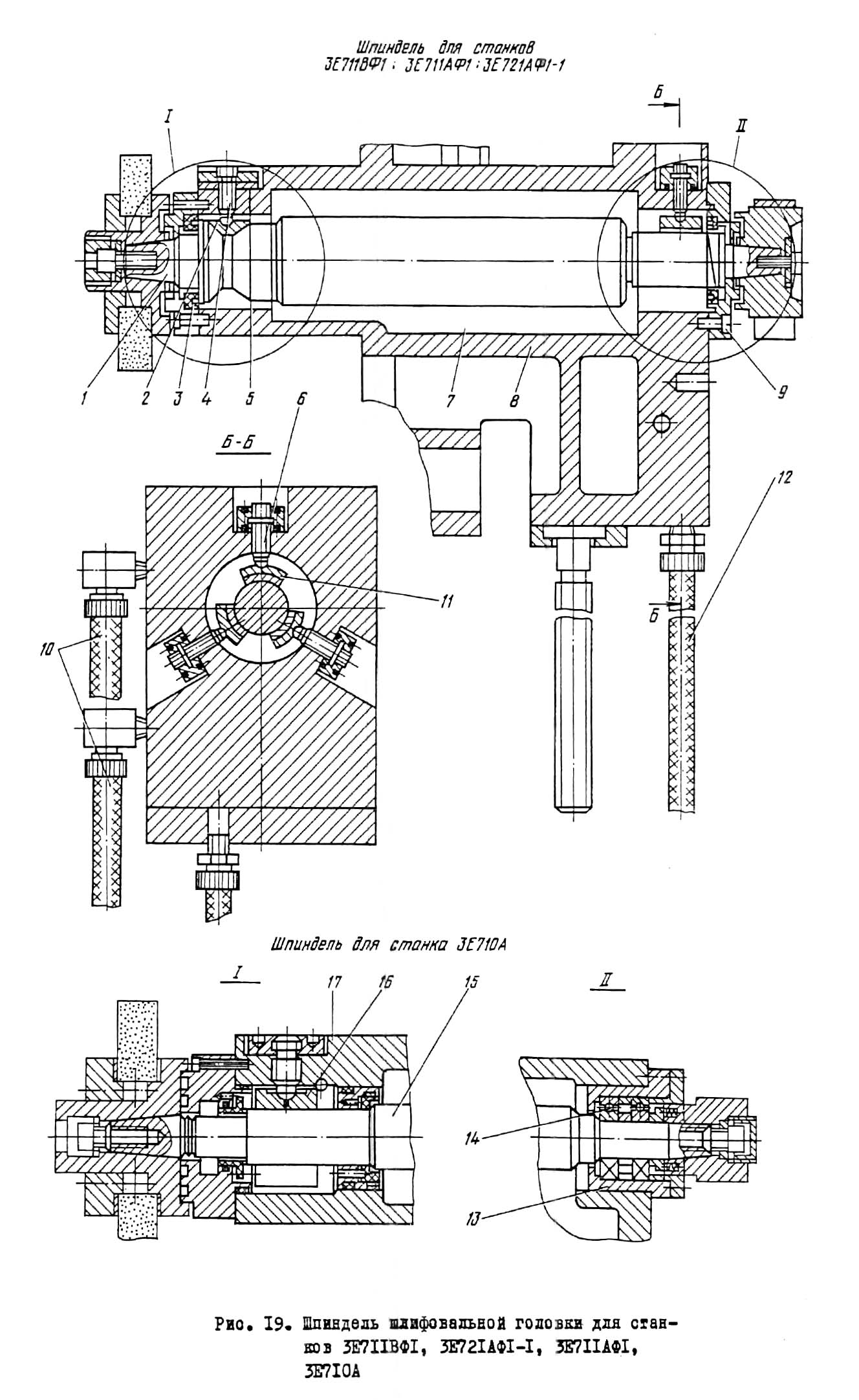 На верстатах 3Е711ВФ1, 3Е711АФ1, 3Е721АФ1-1 шпиндель I (рис. 19) обертається у двох гідродинамічних підшипниках 2 і 11. Передній V-подібний підшипник 2 сприймає як радіальні, так і осьові зусилля. Сферичні поверхні штирів 4, що утримують вкладиш, дозволяють останнім самовстановлюватися в напрямку обертання. Зазор у передньому підшипнику 2 регулюється підшліфуванням компенсаторів 5, а в задньому - встановлюються переміщенням по різьбленню самих штирів 6. Для забезпечення прилягання вкладишів опори в У-подібному пазу шпинделя два нижніх штирі виконані з ексцентриситетом сфери щодо посадкової поверхні. Підшипники 2 і 11 знаходяться в масляній ванні 7, утвореної корпусом головки 8 і ущільненнями 3 і 9. Для заливання рекомендується застосовувати ретельно фільтровану олію І-5А з кінематичною в'язкістю при 50°С 4-5 ст. Мастило підводиться гнучкими шлангами 10. Дренаж здійснюється шлангом 12.