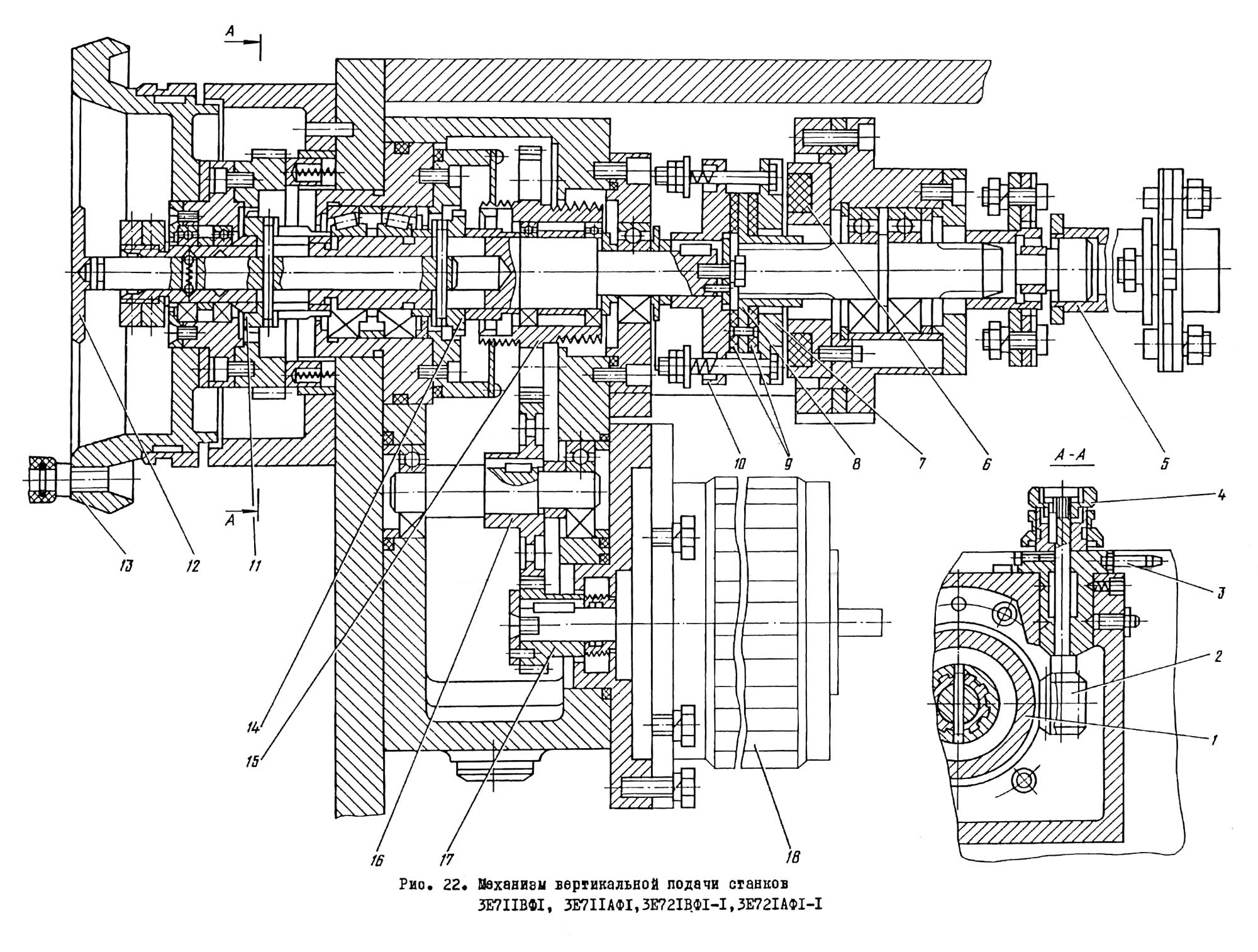 На верстатах 3E711В-I і 3E710A відмінною особливістю механізму вертикальної подачі є, що автоматична подача виробляється електродвигуном 16 (рис. 23) з друкарським якорем, через муфту 15, зубчасті колеса 14, 13, 12, 11, 10, 9, 9 з'єднувальний механізм вертикального подавання з редуктором. Розмір подачі регулюється дисковим друкарським якорем електродвигуна ПЯ-250.