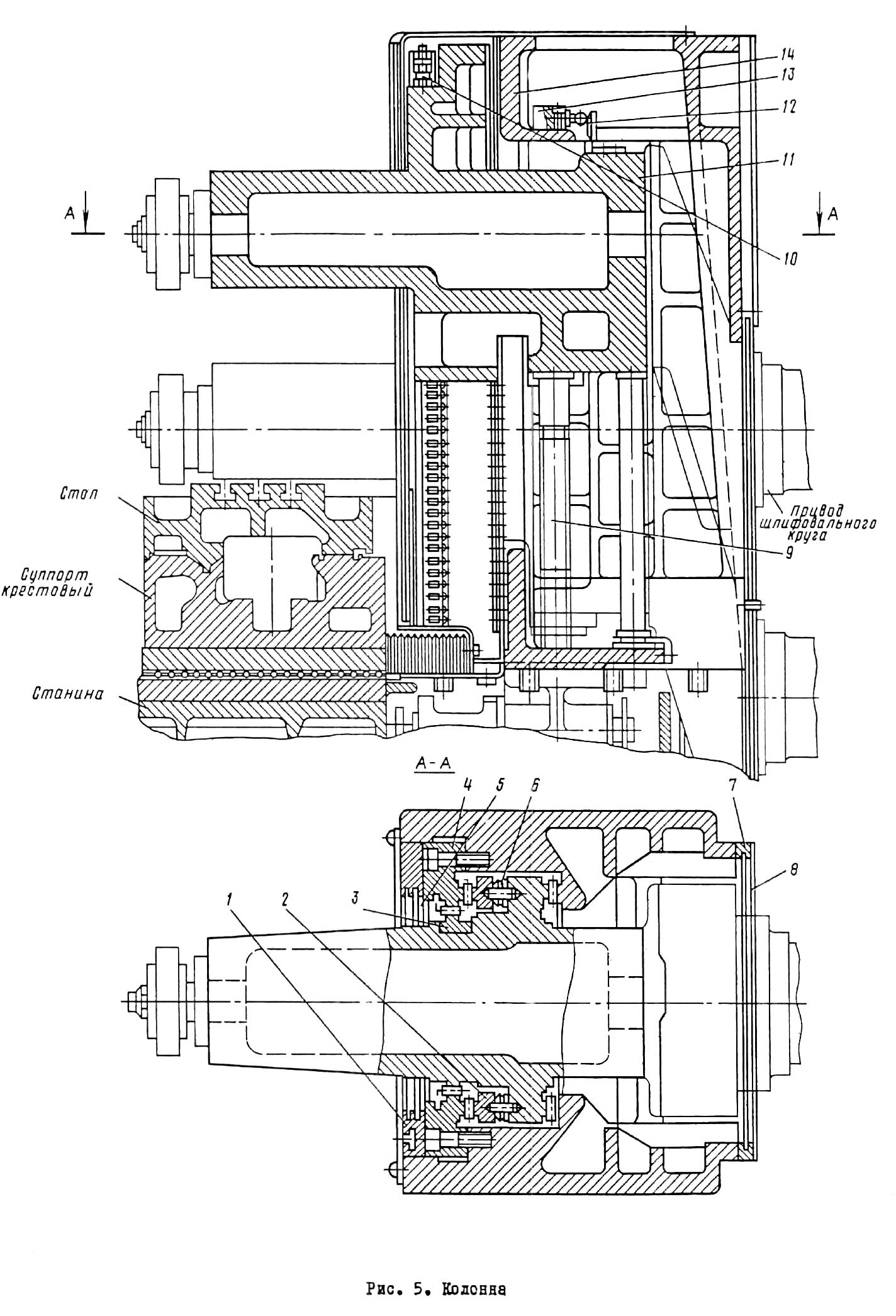 Тонка ручна подача забезпечується кнопкою 4 через черв'як 2, косозубого колеса 1 на маховик 13 і через муфту II на карданний вал 5. За допомогою кнопки 12 включається муфта II при ручній подачі або зубчасте колесо 14 при автоматичній.