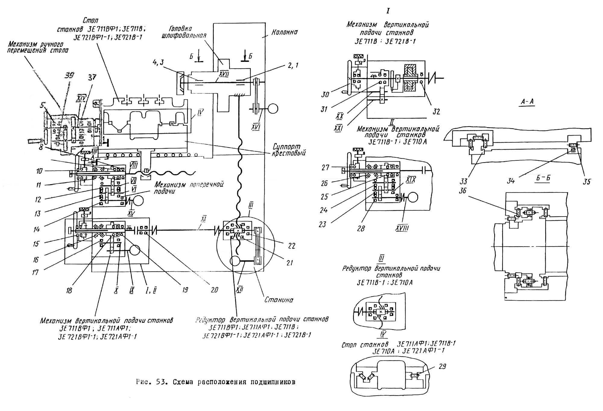 У верстатах 3Е711АФ1, 3Е721АФ1-1, 3E711B-1 і 3E710A відмінною особливістю є те, що по верхнім напрямним 14 і 15 супорта стіл переміщається на роликах 13.