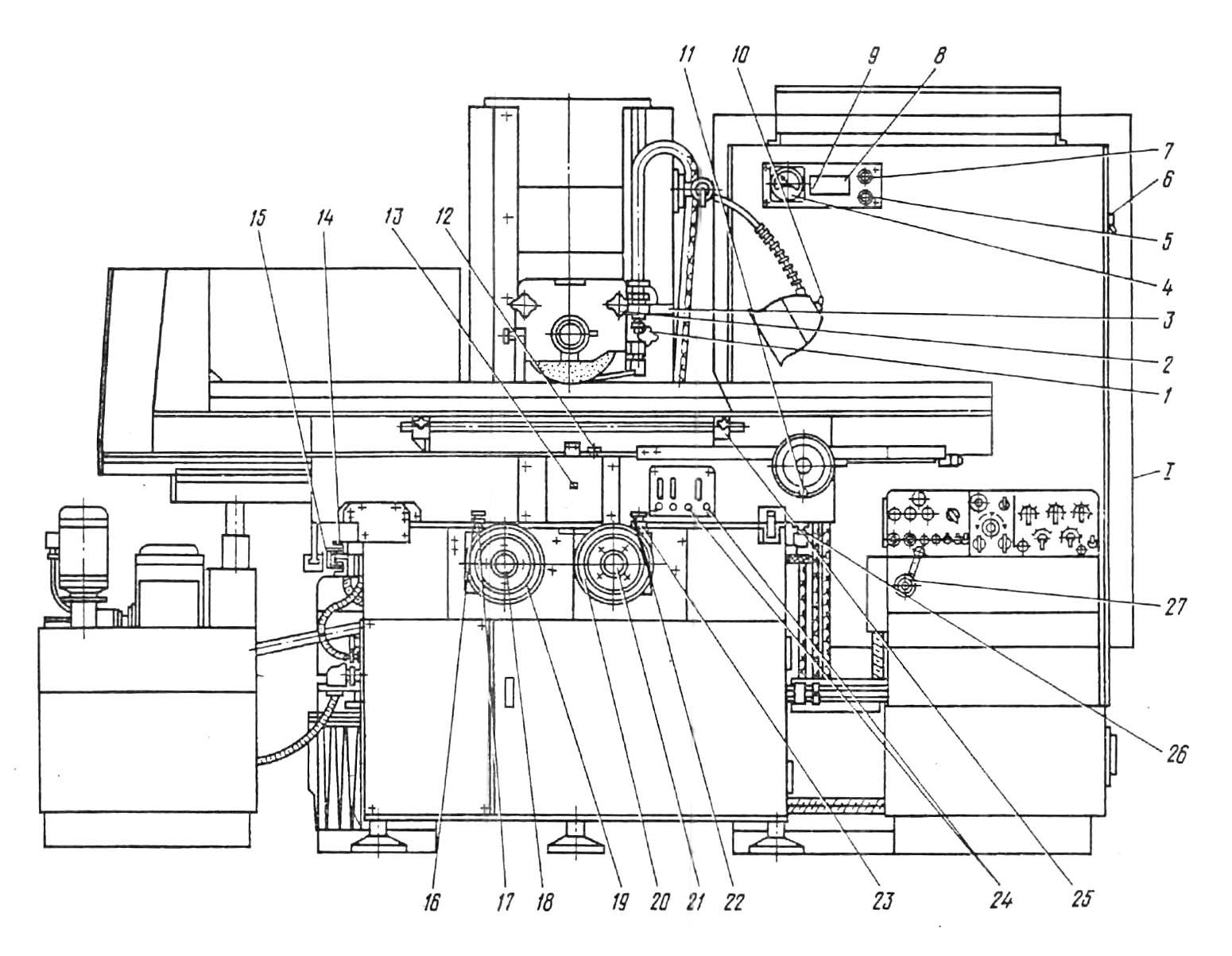Основні механізми та рухи у верстаті . На станині змонтовано колону. Хрестовий супорт перемішається по горизонтальним напрямним кочення станини. Стіл здійснює поздовжній зворотно поступальний рух на горизонтальних направляючих кочення. Шліфувальна головка переміщається вертикальними напрямними колони. У верстаті змонтовані механізми вертикальної та поперечної подачі, а також гідропривід.