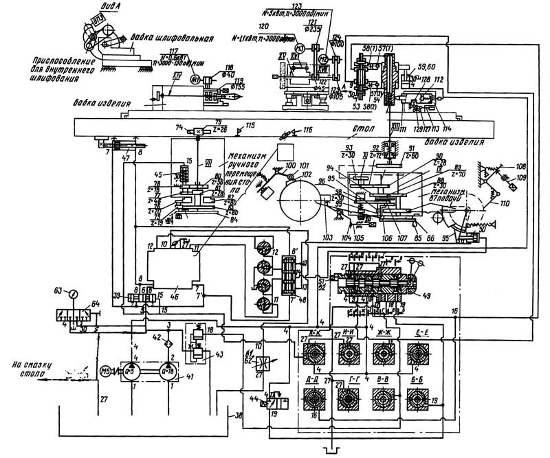 Привід шлифовального круга внутреннего шлифования осуществляется от електродвигуна 120 через плоскоременную передачу со шкивами 121 і 122 на вал ХV (шпиндель внутришлифовальный).