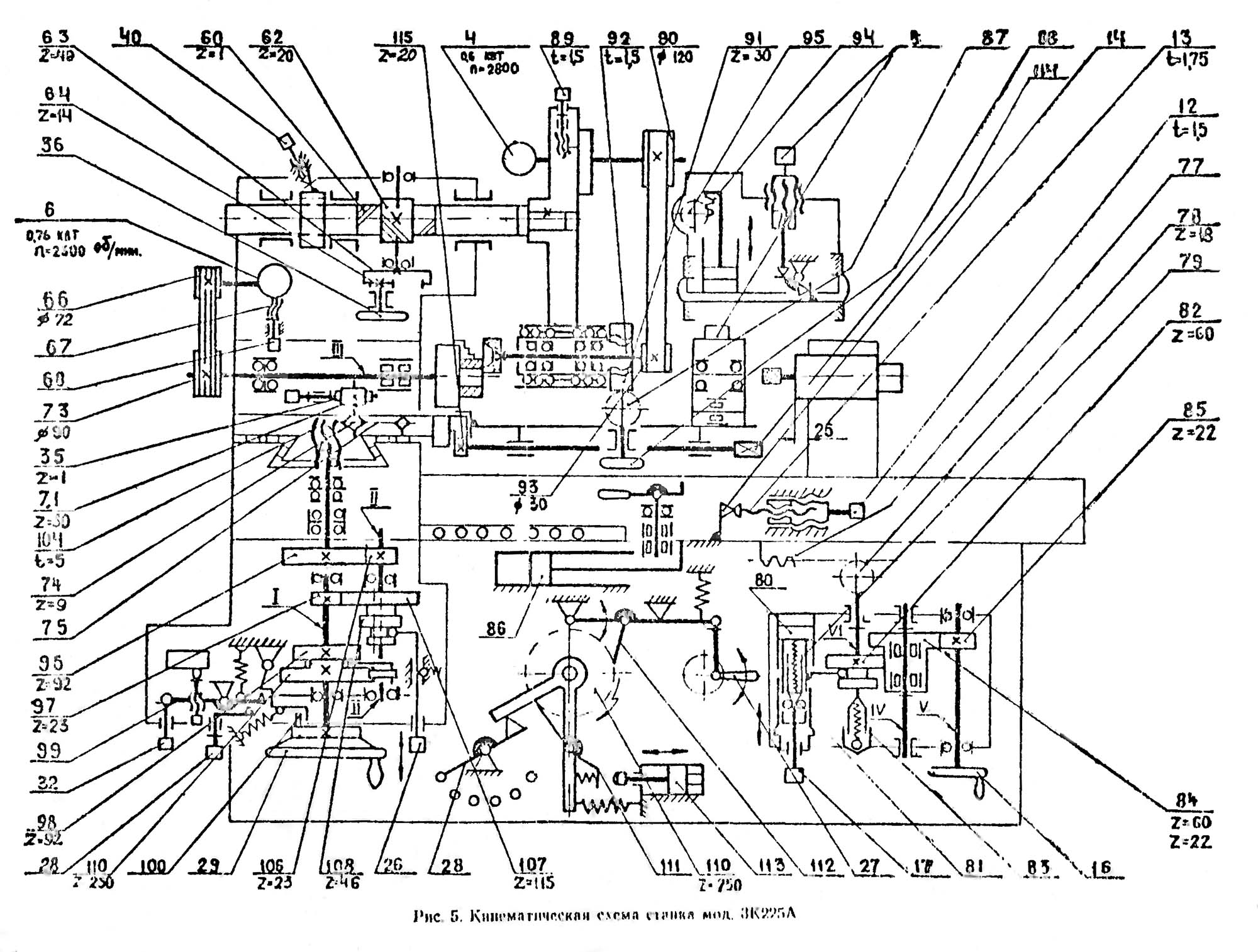Схема кінематична внутришлифовального верстата 3К225. Дивитись у збільшеному масштабі