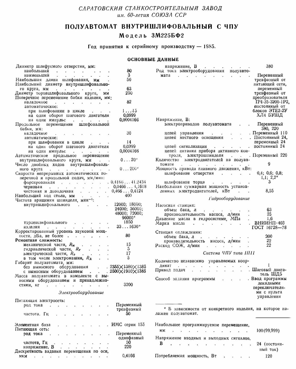 Початок виробництва внутрішньошліфувального верстата 3М225 (рік прийняття до серійного виробництва) - 1985 рік.