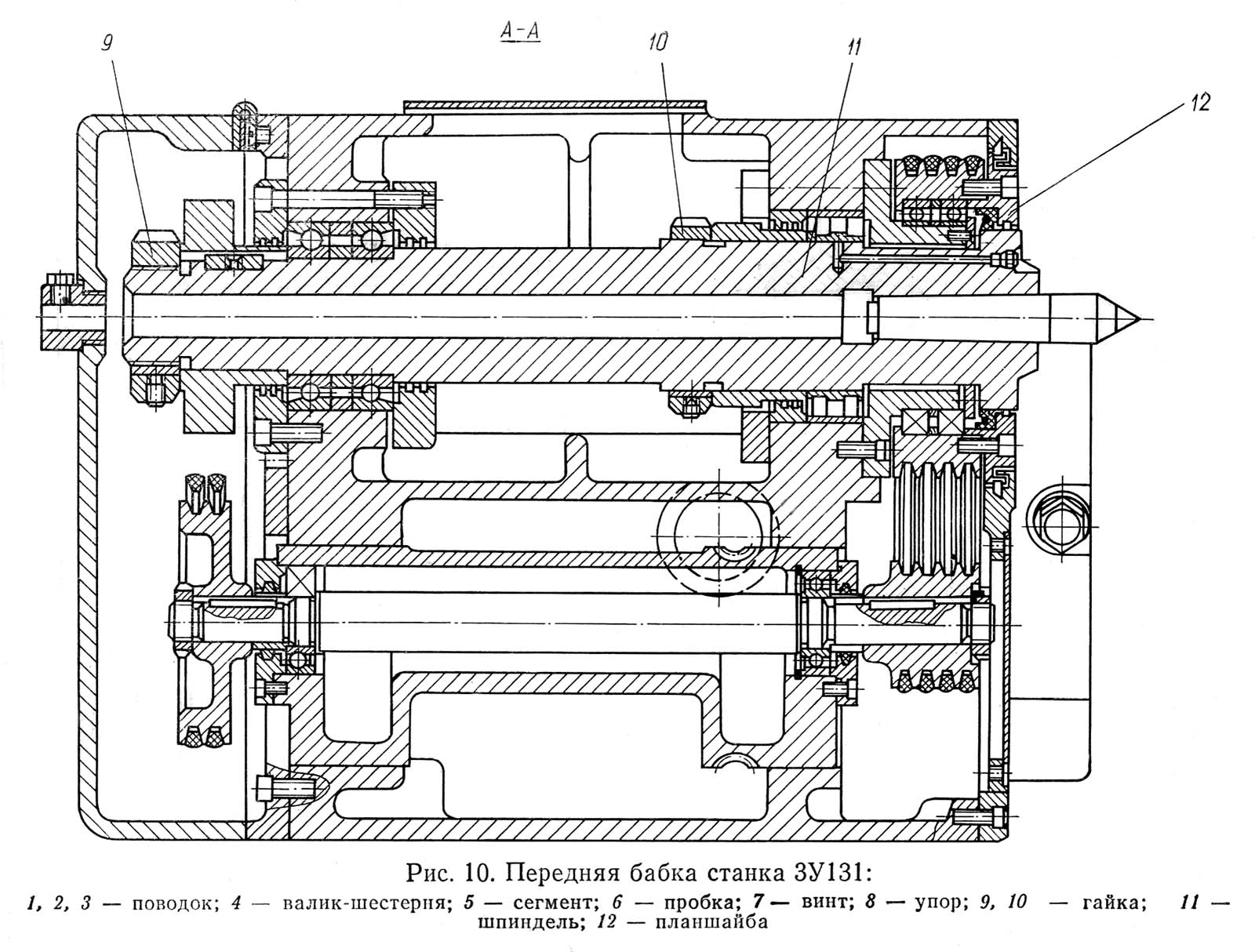Передний подшипник регулируется гайкой 10 через отверстие, закрытое крышкой, в корпусе бабки. Чтобы избежать чрезмерной затяжки, следует непрерывно проворачивать шпиндель. Гайка стопорится винтом, который нужно ослаблять при регулировке.