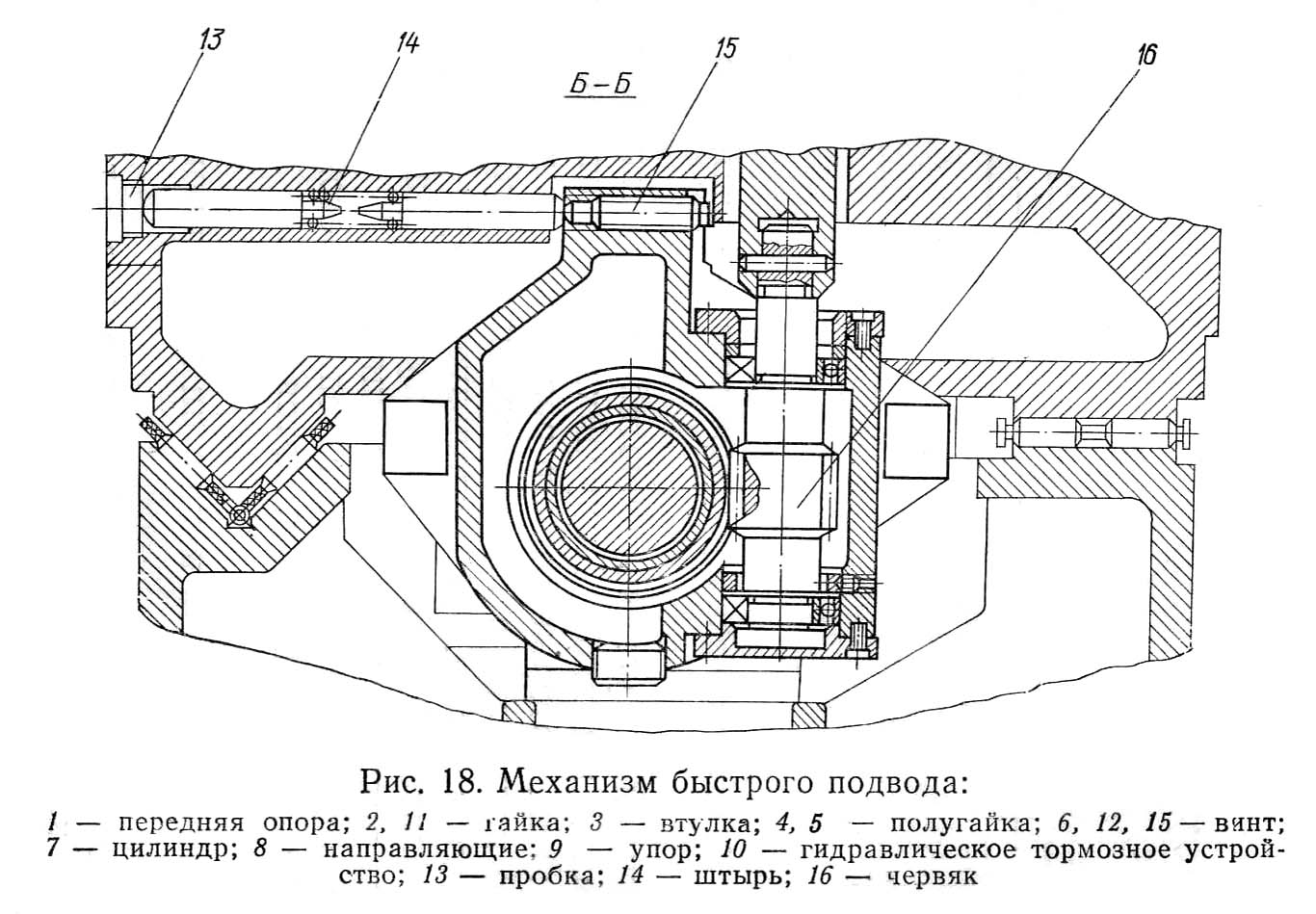 Механізм состоит из вузла швидкого подвода шлифовальной бабки і пары винт — гайка качения з червячной передачей (рис. 18, 19). Узел швидкого подвода состоит из цилиндра і гідравлических тормозных устройств. Узел винт — гайка качения включает в себя винт 6, две полугайки 4 і 5, втулку з червячным колесом і червяк, соединенный з вертикальным валом механізма подачі. Корпус гайки 11 сцеплен з выступами шлифовальной бабки. В каждой полугайке имеются три независимые группы циркулирующих шариков. Полугайки сцепляются з втулкой зубчатыми венцами, которые имеют различное число зубьев. При перестановке полугаек на одинаковое число зубьев они поворачиваются на разные углы, что используется при регулировке осьового натяга в винтовой паре. Радиальную фиксацию ходового гвинта обеспечивают роликовые направляющие.