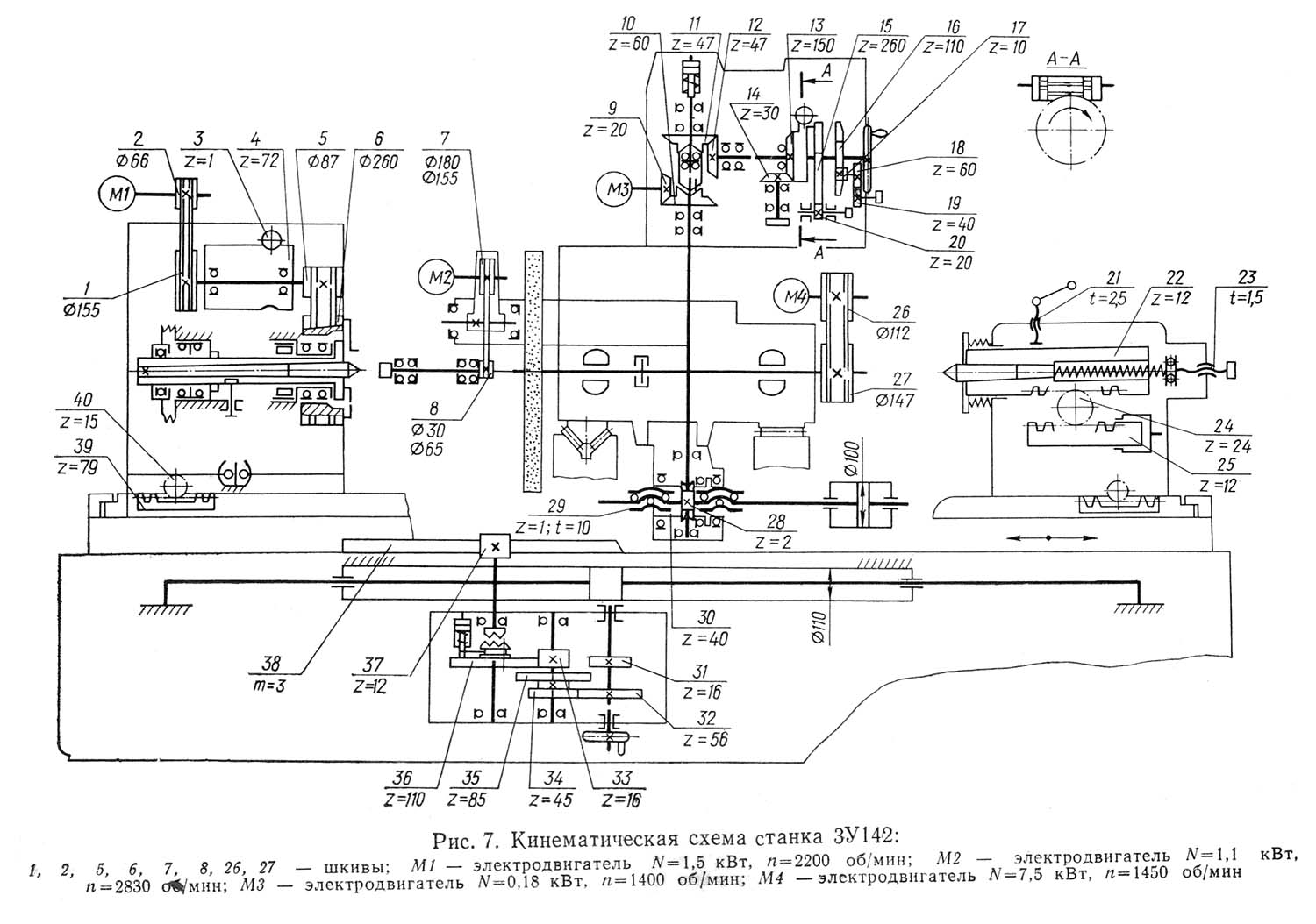 Схема кінематична круглошлифовального верстата 3У144. Дивитись у збільшеному масштабі
