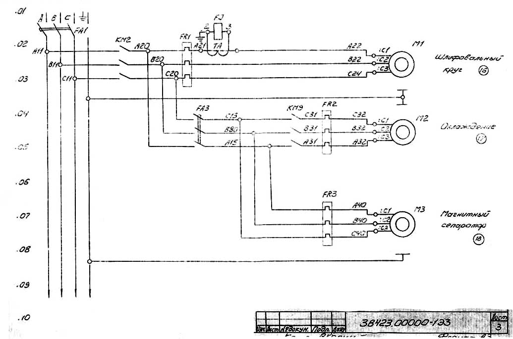 При нажатии кнопки SB3 включаются електродвигатели М1 і М3 приводов шлифовального круга і магнитного сепаратора.