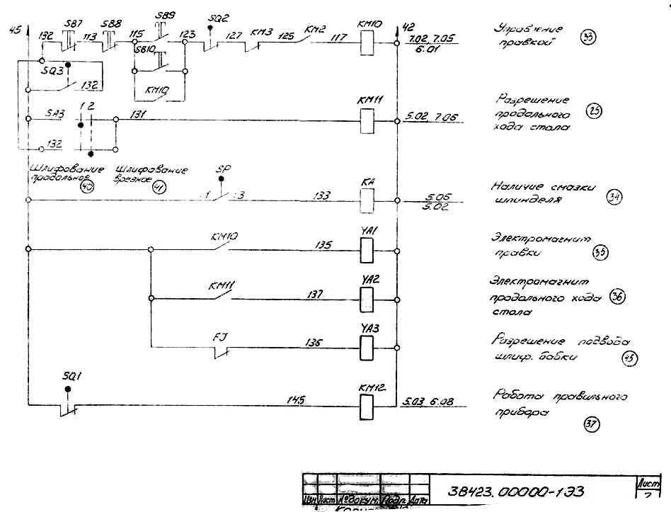 Подвод шлифовальной бабки разрешается при включенном електромагните YF3, т.е. при отсутствии перегруза шлифовального круга реле FJ.