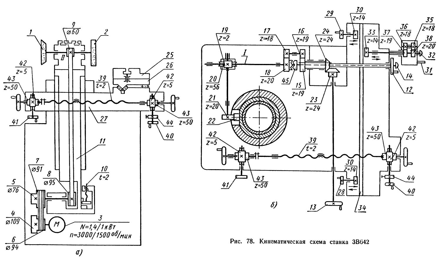 Шлифовальная головка з шлифовальными кругами 1 і 2 (рис. 78, а) смонтирована на верхней частини вертикальной колонны 11 і може поворачиваться з ней вокруг вертикальной оси (рис. 78, б). Кроме поворота, колонна може перемещаться вверх или вниз з помощью маховиков 12 или 13. От маховика 12 рух на вал I може передаваться непосредственно, если кнопкой 14 включить муфту 45 (быстрое движение) или через планетарный механізм з зубчатыми колесами 15—18 і далее через червячную передачу 19—20 на реечную пару з реечным колесом 21 і рейкой 22, закрепленной на колонне (медленное движение).
