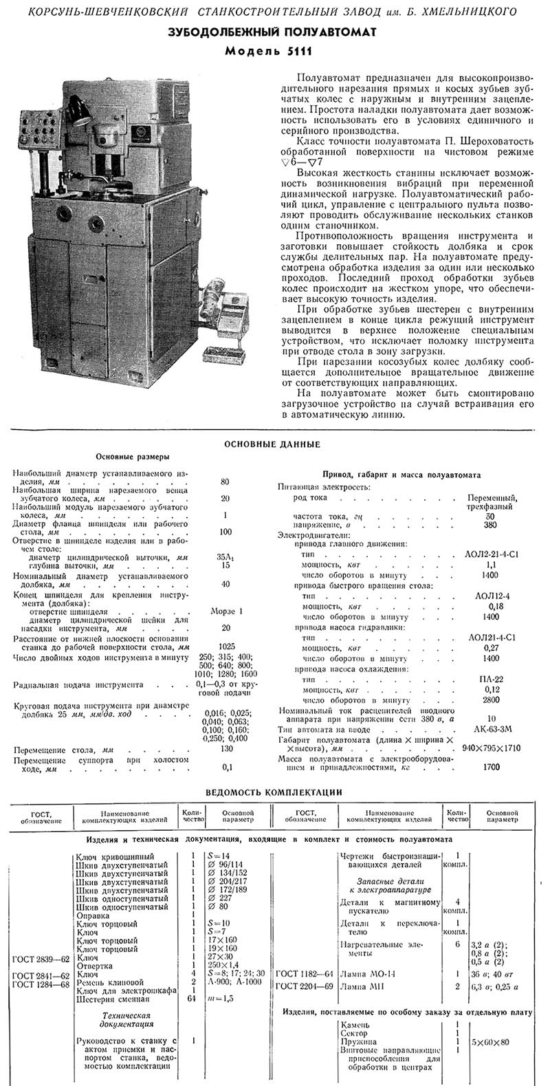 Зубодолбежный напівавтомат 5111 предназначен для высокопроизводительного нарізання прямых і косых зубьев зубчатых колес з наружным і внутренним зацеплением. Простота налагодження напівавтомату дает возможность использовать его в условиях единичного і серийного производства.