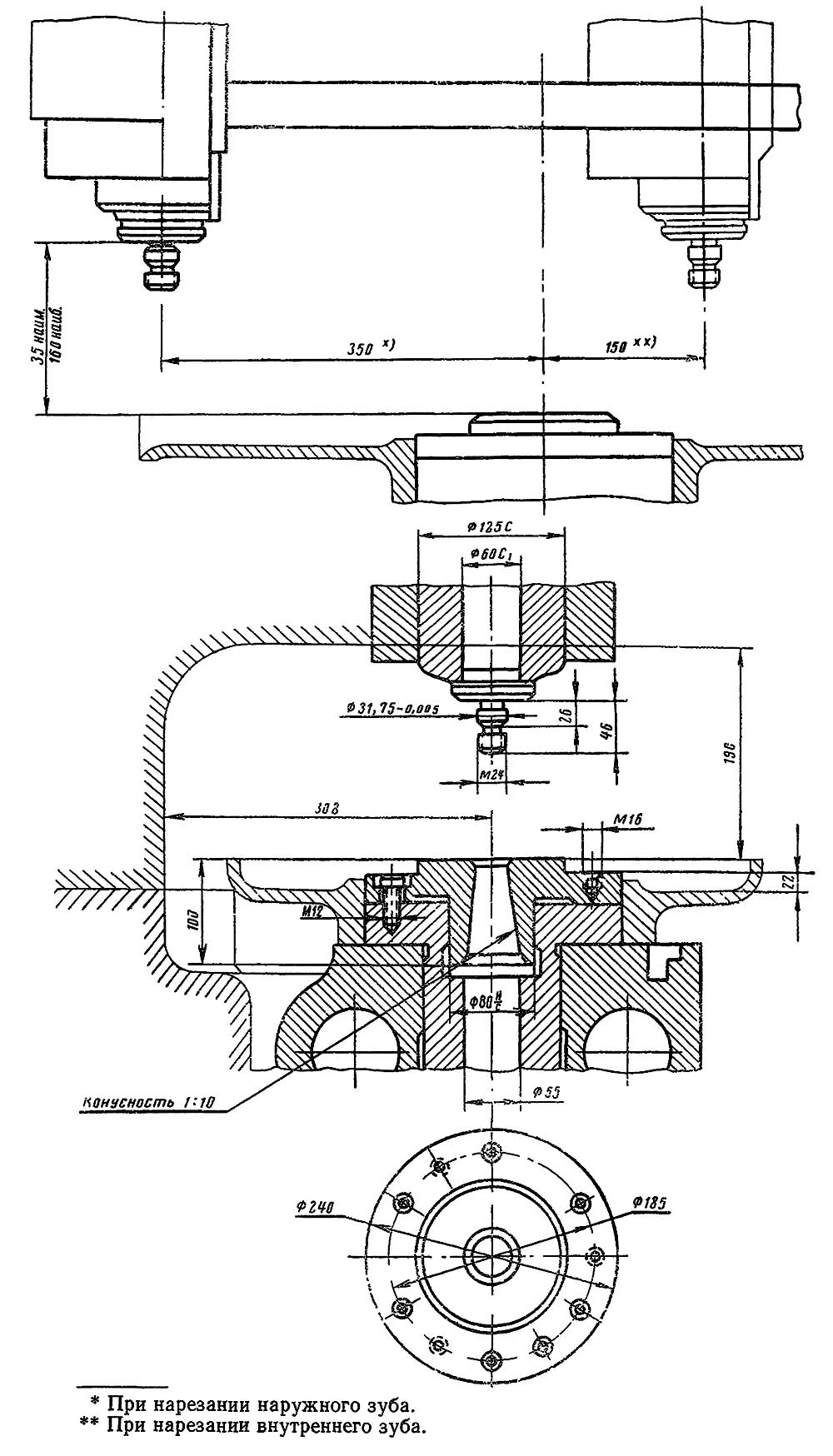 К верстату прилагаются три пары сменных колес, позволяющих установить одну из шести круговых подач долбяка sкр = 0,17; 0,21; 0,24; 0,30; 0,35; 0,44. Так как на расстояние между осями сменных колес неизменно, требуется, чтобы сумма их зубьев всегда была равна 89.