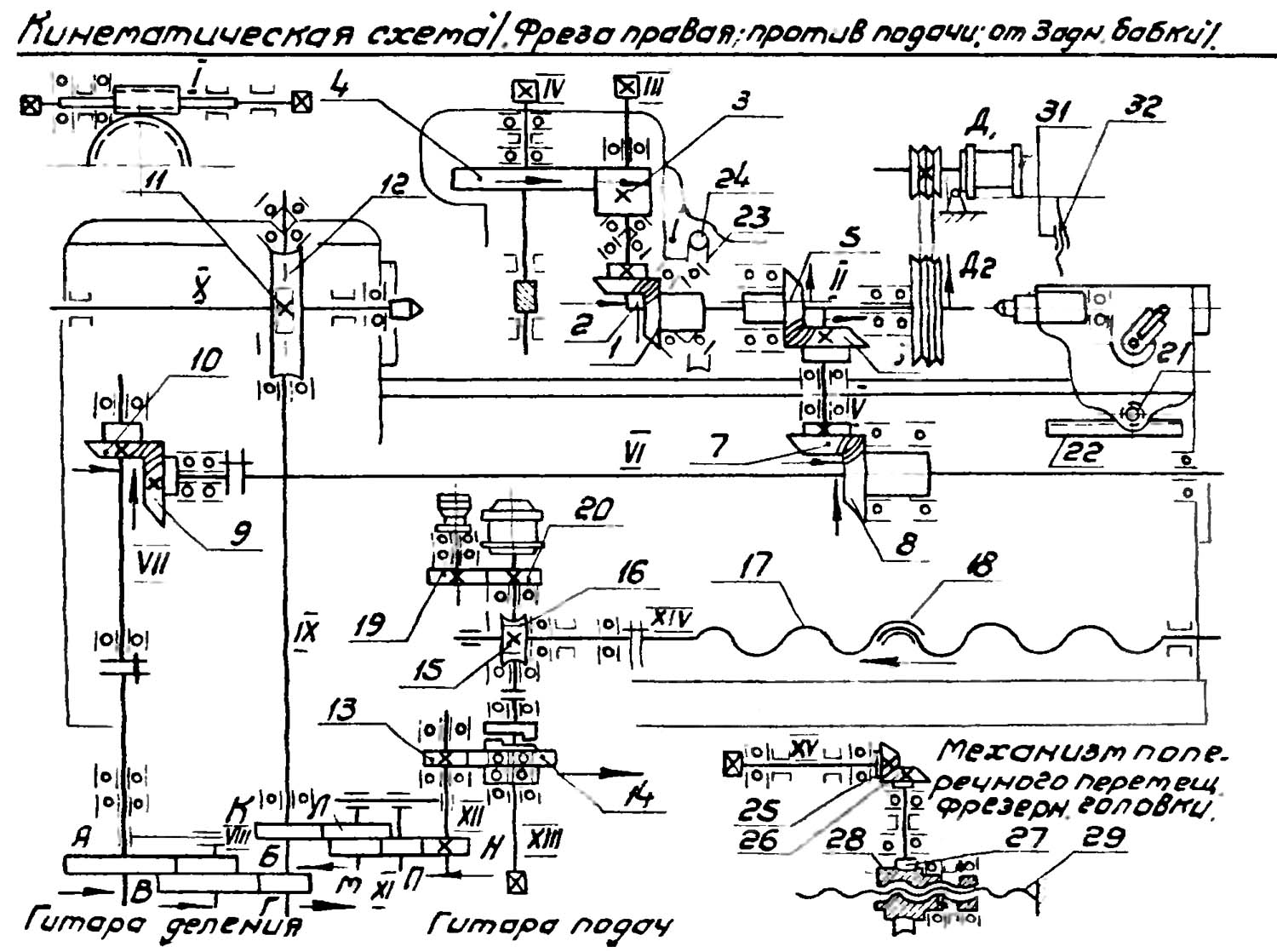 Ланцюг головного руху - електродвигатель 25, клиноременная передача со сменными шкивами 24 і 23 і передачи 1—2, 3—4. Ланцюг деления связывает фрезерный шпиндель IV со шпинделем вироби X передачами 4—3, 2—1, 5—6, 7—8, 9—10, сменными колесами гітари деления а—b і с—d і червячной передачей 11—12. Ланцюг подач (связывает шпиндель вироби з винтовой парой 17-18) - червячная передача 12-11, сменные колеса подач a1-b1 і с1 -d1, цилиндрическая передача 13-14 і червячная пара 15—16. Быстрое вращение ходовой винт получает от електродвигуна 26 швидкого ходу через червячную передачу 15 — 16 при выключенной муфте 29. Вручную ходовой винт вращают через передачу 19-20 і 15—6. В процессе фрезерування детали сообщается только вращательное рух обката, осевая подача на станке осуществляется поступательным движением вращающегося инструмента.