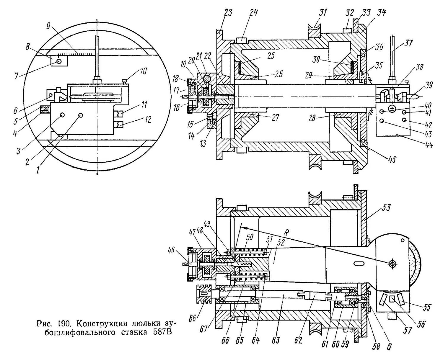 Обкатная люлька зубошлифовального верстата показана на рис. 190. Она состоит из барабана 34, монтируемого в расточку бабки вироби на роликах 32. На нем закреплен диск 33, являющийся опорным подшипником ковзання і удерживающим барабан от осевых перемещений, червячное колесо 31 і тормозной диск 23. В передньої і задньої стенках барабана 34 имеются прямоугольного сечения отверстия. На нижних плоскостях отверстий закреплены прямоугольные направляющие 28 і 27. На верхних плоскостях отверстий также закреплены направляющие 29 і 26, имеющие по одной скошенной плоскости. Эти направляющие могут перемещаться за счет изменения толщины компенсационных планок 30 і 25, увеличивая или уменьшая тем самым прямоугольные отверстия по высоте. В прямоугольное отверстие помещен супорт 52, имеющий возможность скользить между направляющими 28, 27, 29 і 26.