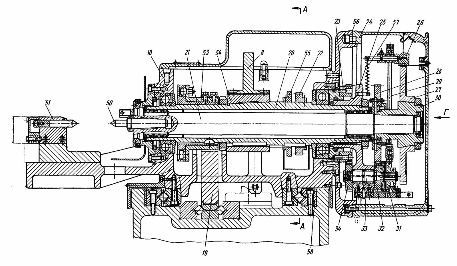 Ручное перемещение пиноли 50 производится от квадрата на валу зубчатого колеса 37.