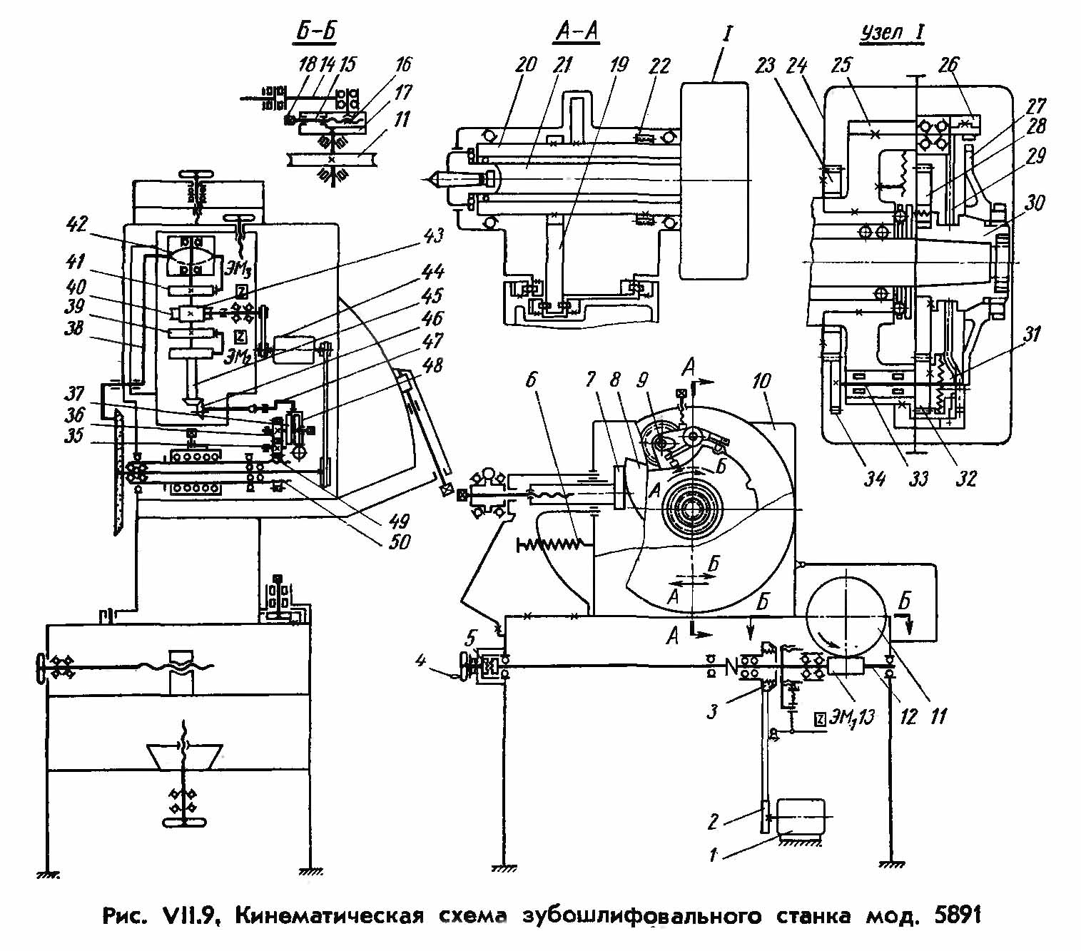 Кінематична схема зубошлифовального верстата 5891. Дивитись у збільшеному масштабі