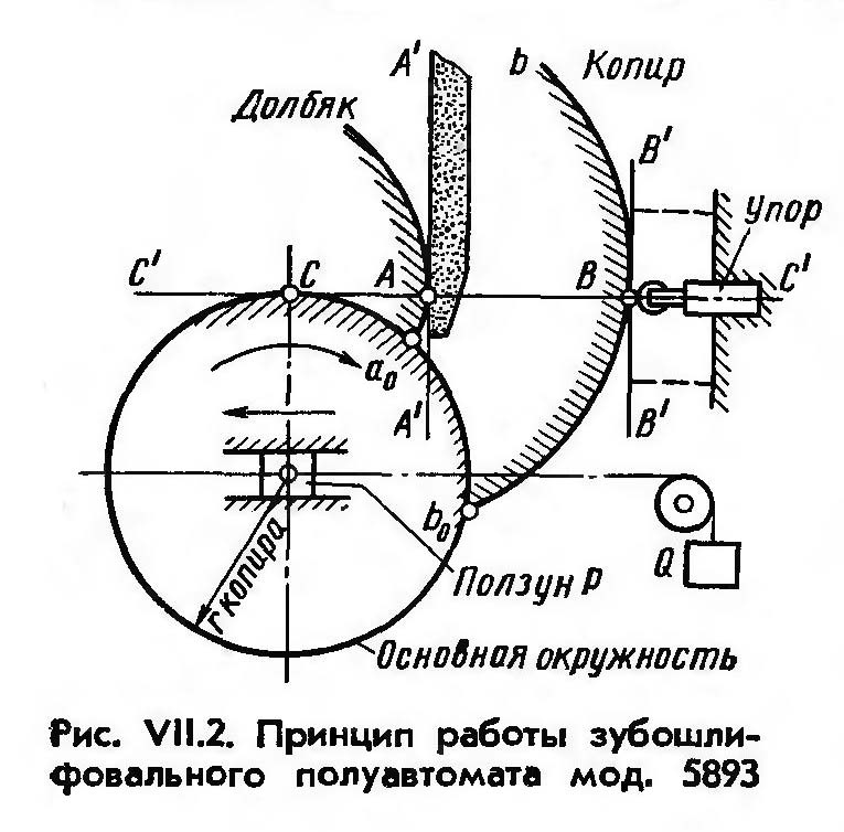В описываемом напівавтоматі 5893 роль касательной А'А' к евольвенте а0а играет плоскость шлифовального круга, роль второй евольвенты b0b — профиль точного копира, соосного со шлифуемым долбяком і находящегося в постоянном контакте з роликом нерухомого упора под действием пружины или груза Q. Таким образом, профиль копира b0b катится по нерухомою касательной В'В', соприкасаясь з ней в точке В, в то время как профиль а0a зуба долбяка катится по касательной А'А' соприкасаясь з плоскостью шлифовального круга (точнее, со следом етой плоскости) в точке А.