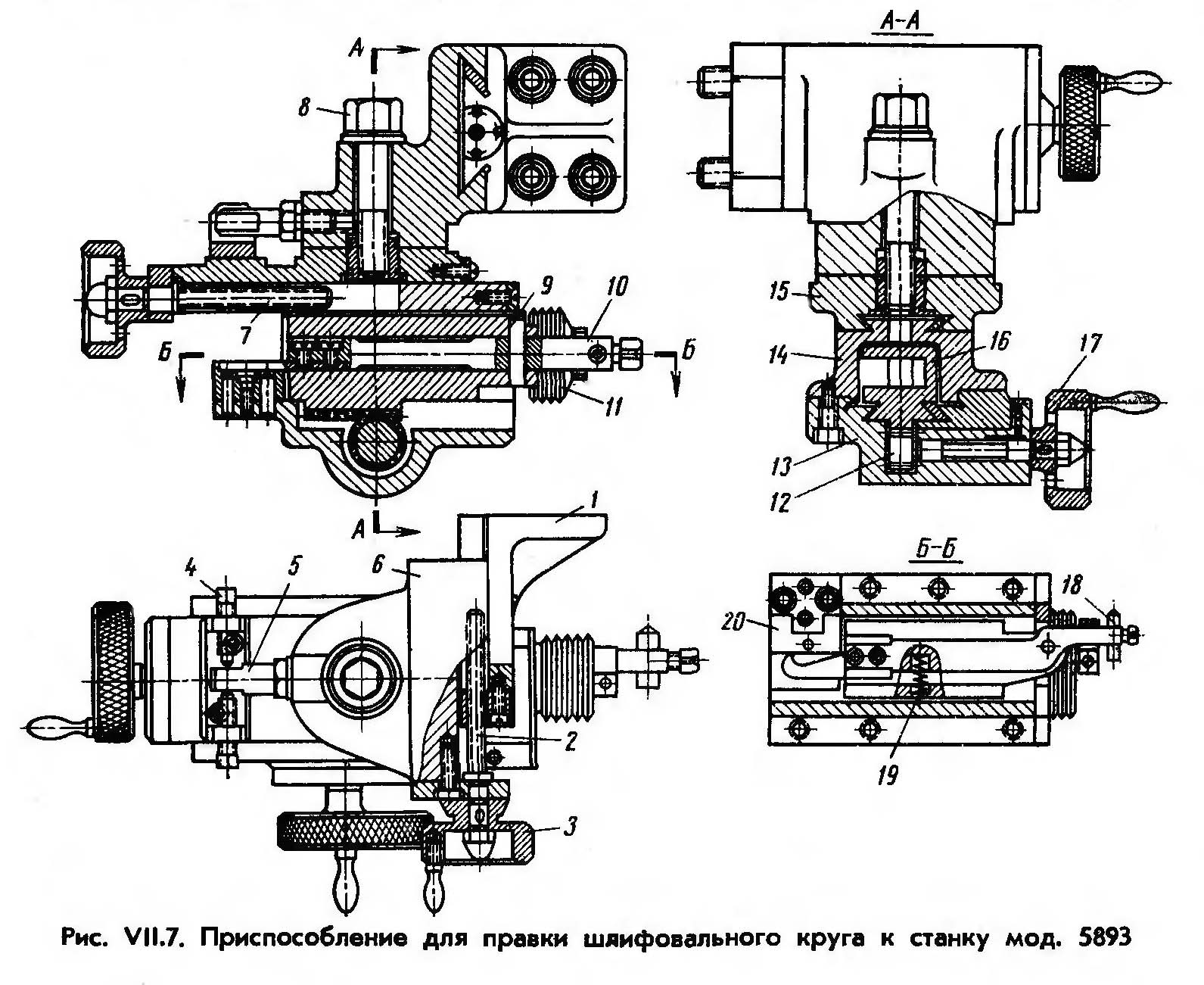 Рычаг 10 все время прижимается к копиру 20 пружиной 19. Направляющие ползуна защищены «гармошкой» 11. При правке круга вращают маховичок 17; подача алмаза на круг осуществляется поворотом маховичка 3.