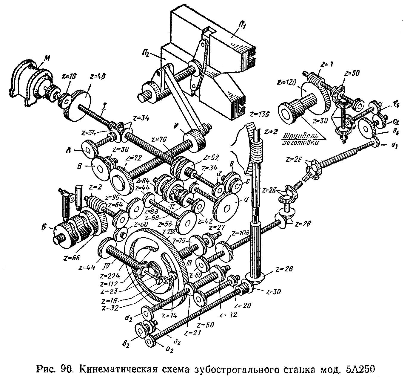 1. Кінематична схема зубострогального верстата 5А250П. Дивитись у збільшеному масштабі