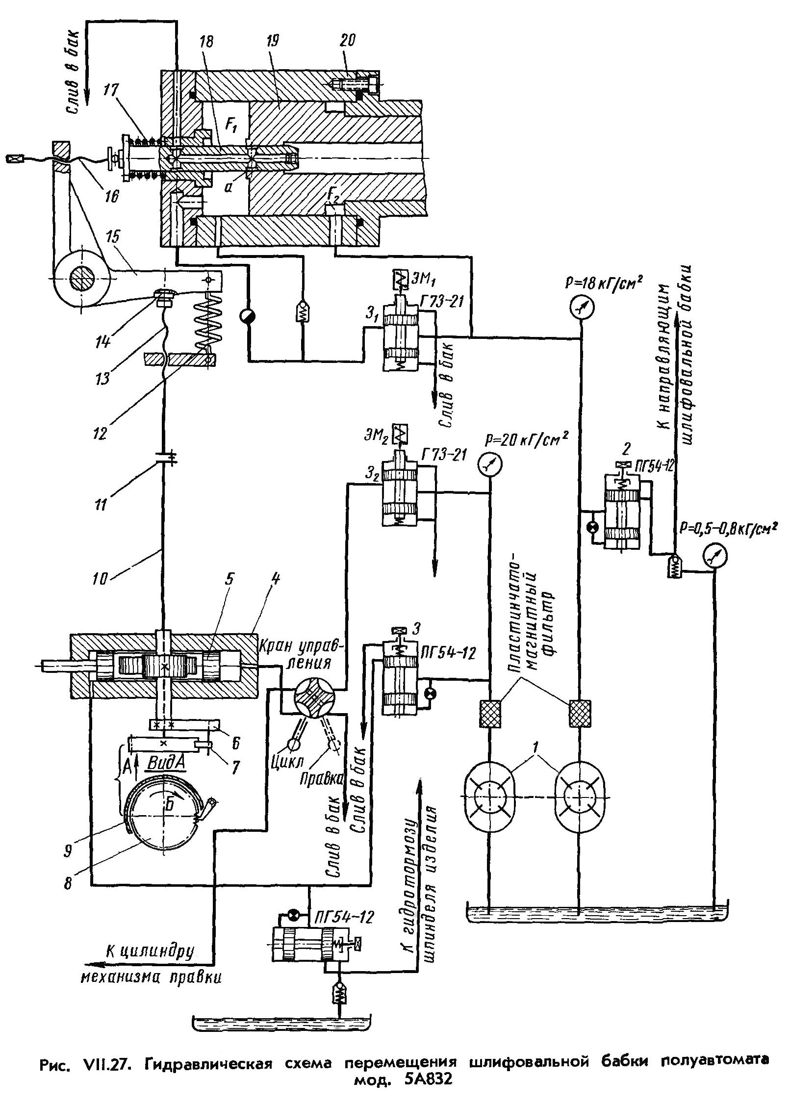 Отвод шлифовальной бабки (автоматический) після окончания шлифования происходит при выключенных електромагнитах ЭМ1 і ЭМ2 (рис. VII.27). Масло из полости F1 цилиндра 20 сливается в бак, а поршень со штоком і шлифовальной бабкой под давлением в полости F2 отводится назад.