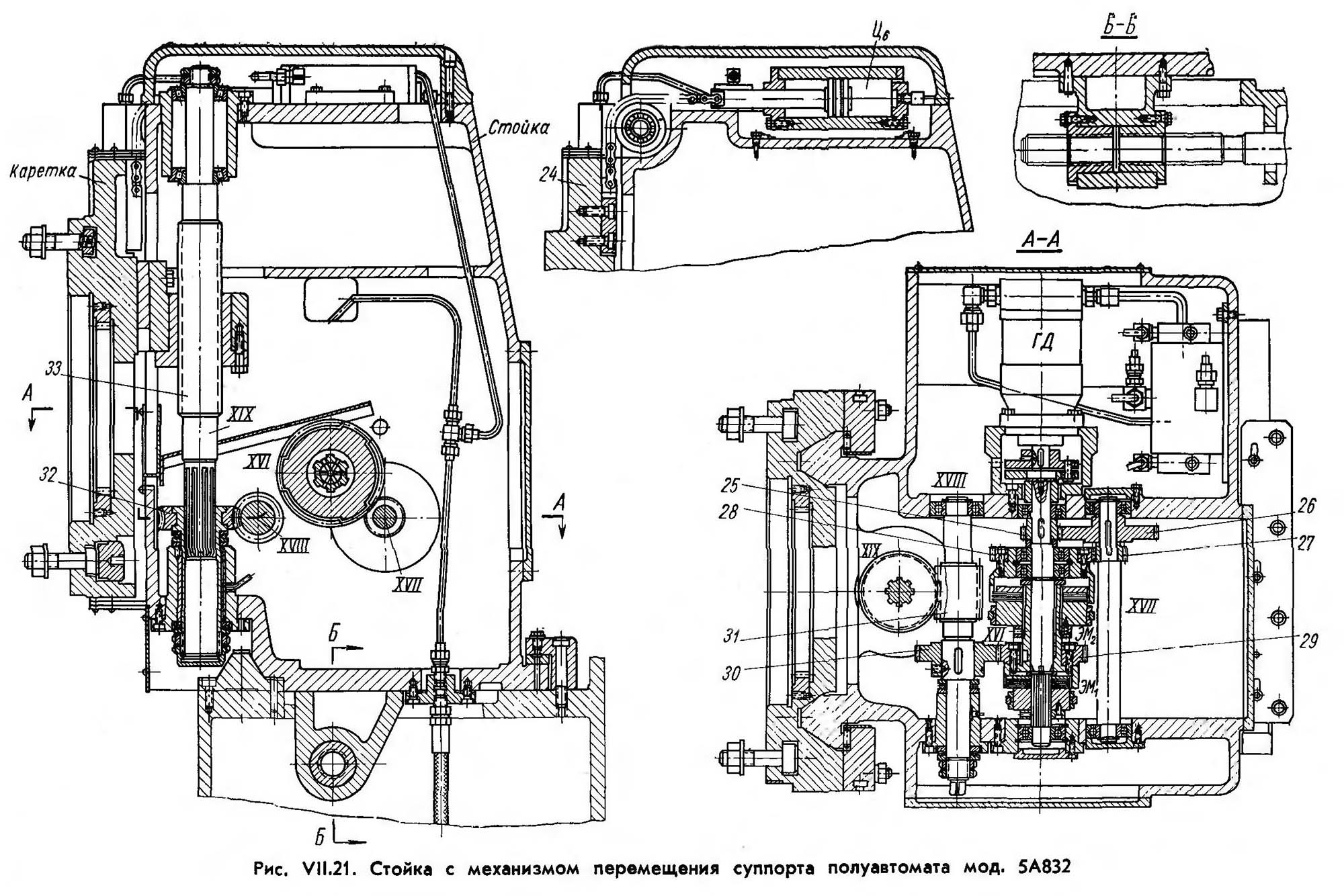 При совместном включении електромагнітних муфт ЭМ1 і ЭМ2 происходит торможение суппорта. Реверсирование руху суппорта в его крайних положениях осуществляется от гідроприводу при встрече упоров 25 (рис. VII.19) з расположенными на каретке конечными выключателями. Каретка 24 з суппортом 23 уравновешиваются двумя цилиндрами Ц6 (рис. VII.21 і VII.32), которые укреплены в верхней частини стойки.