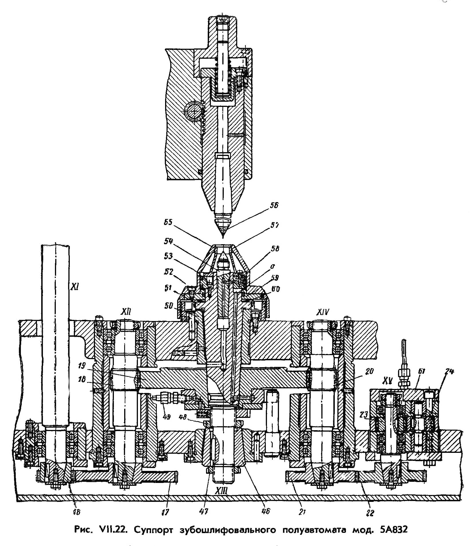 В нижней частини суппорта смонтирован шпиндель 51 (рис. VII.22), верхней опорой которого служит бронзовый подшипник 50 з конической (конусность 1 : 10) опорной поверхностью. Нижня опора выполнена в виде конической втулки 46 (конусность 1:5) из легированной стали з закалкой до твердости HRC 45..50. Втулка 46 посажена на шпонку, расположенную в цилиндрической нижней частини шпинделя 51.