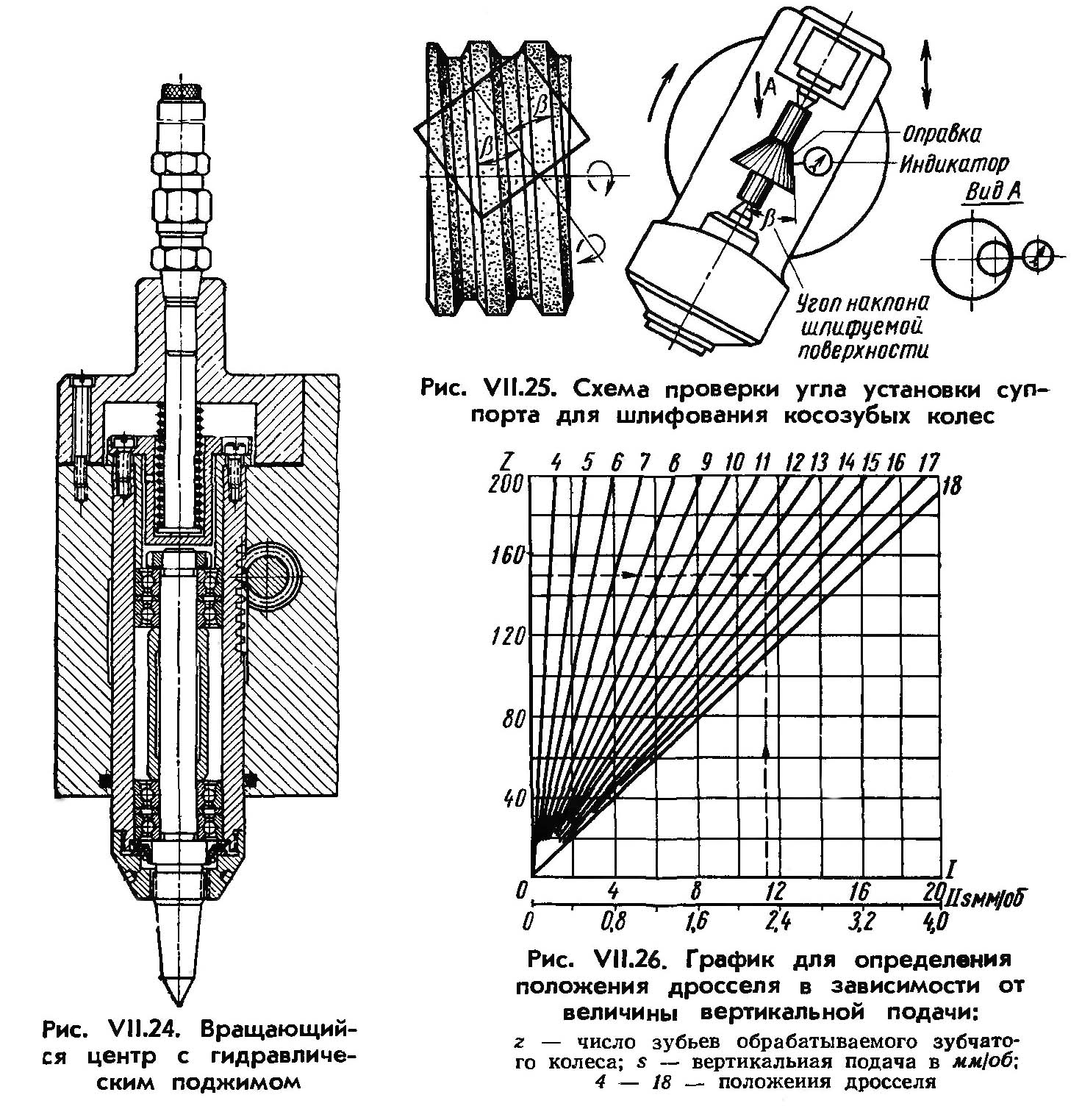 При обработке цилиндрических косозубых колес супорт должен быть повернут на соответствующий угол. Точность установки угла наклона лучше всего контролируется индикатором по конической оправке (рис. VII.25) з углом, соответствующим углу наклона зуба шлифуемой заготовки. Оправка зажимается в центрах, индикатор закрепляется на нерухомою шлифовальной бабке.
